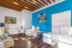 Stell dir vor, du betrittst die hellen Räume der Agentur und spürst sofort die entspannte Atmosphäre inmitten des lebendigen Platzes. Draußen plätschert der Brunnen, während drinnen Fotos beeindruckender Immobilien die Wände zieren. Das moderne Ambiente mit bequemen Sitzecken lädt zum ausgiebigen Gespräch ein. Hier entsteht Vertrauen, das zu deiner Traumimmobilie führt – sei es ein rustikales Finca-Haus oder eine moderne Finca in der Nähe von Alaró.