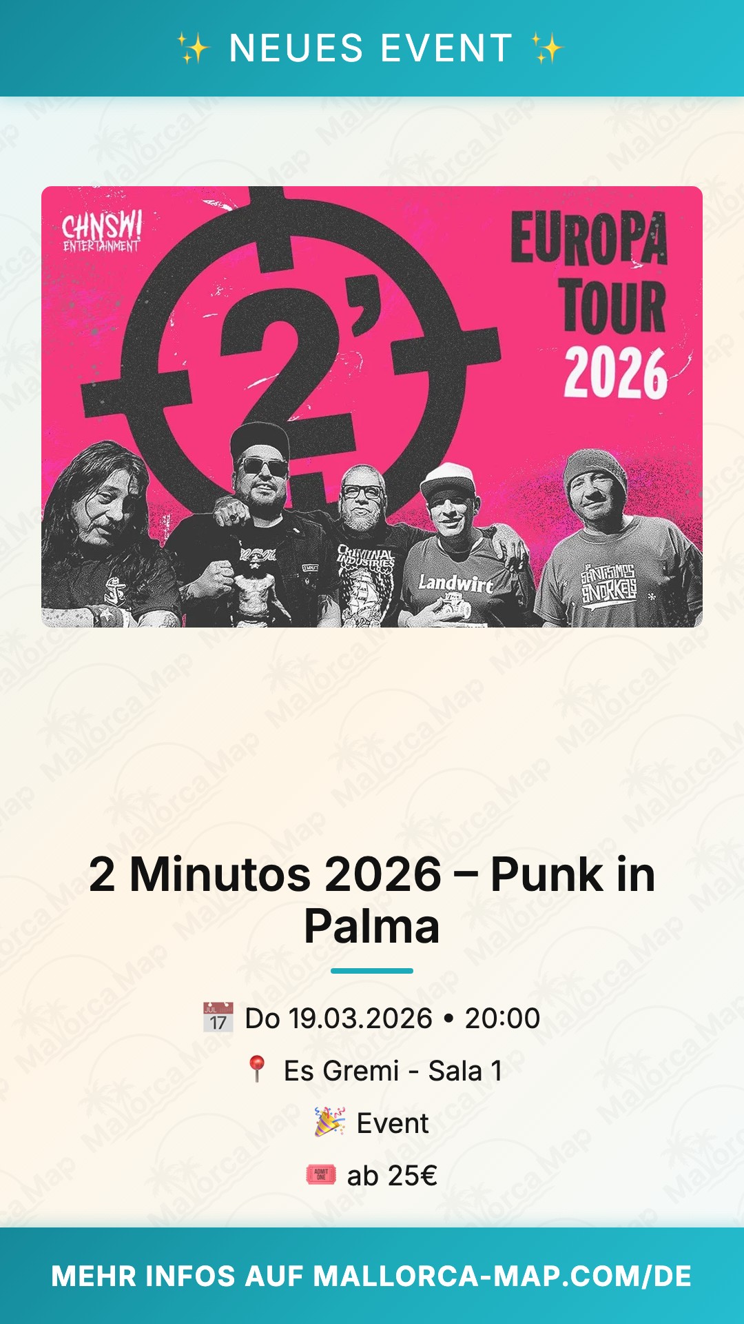 Komm pünktlich, die Show startet um 20 Uhr. Tickets im Vorbestellung für moderate Preise sichern und den Abend genießen. Erlebe 2 Minutos live in Palma – eine seltene Chance für puren Punk auf Mallorca!