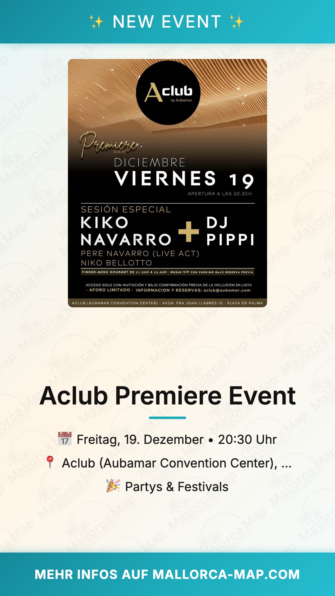 DU tauchst ein in die Premiere eines unvergesslichen Abends im Aclub in Playa de Palma: Das Aclub Premiere Event am Freitag, den 19. Dezember 2025, öffnet um 20:30 Uhr seine Türen für eine spezielle Session voller Energie. Hier in der pulsierenden Atmosphäre von Avda. Joan Labres 10, direkt am Strand von Playa de Palma, wartet eine Nacht, die dich mit Live Act Niko Belotto von 22:00 bis 00:30 Uhr in Ekstase versetzt. Kombiniert mit erstklassigen DJ-Sets und einem gourmet Finger-Menu, wird das Aubamar Convention Center zur Hotspot für Partyliebhaber auf Mallorca.