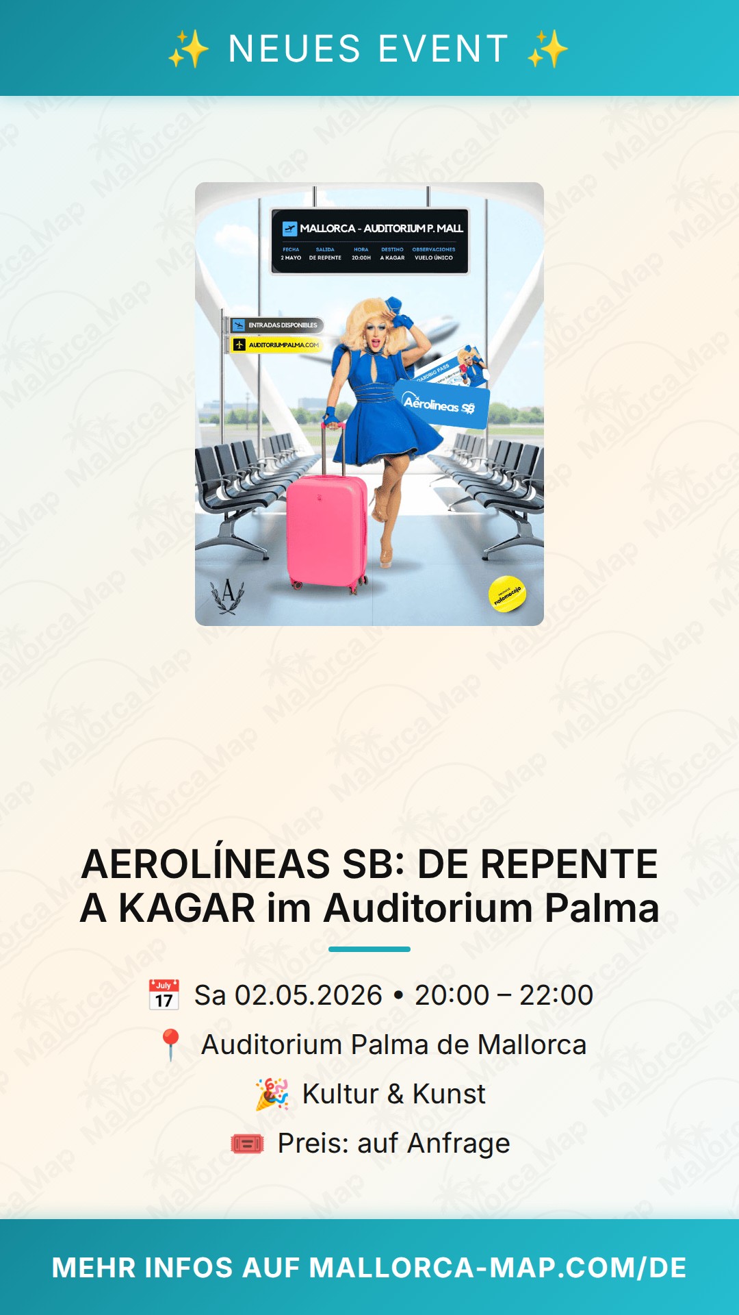 Bist du bereit für einen Abend voller Lachen und erstklassiger Unterhaltung? Am 2. Mai 2026 erwartet dich im Auditorium Palma de Mallorca ein ganz besonderes Highlight: AEROLÍNEAS SB präsentiert ihr Programm „DE REPENTE A KAGAR“. Wenn du auf der Suche nach einem kulturellen Erlebnis bist, das Humor und Performance auf einzigartige Weise verbindet, dann solltest du dir diesen Termin rot im Kalender markieren.