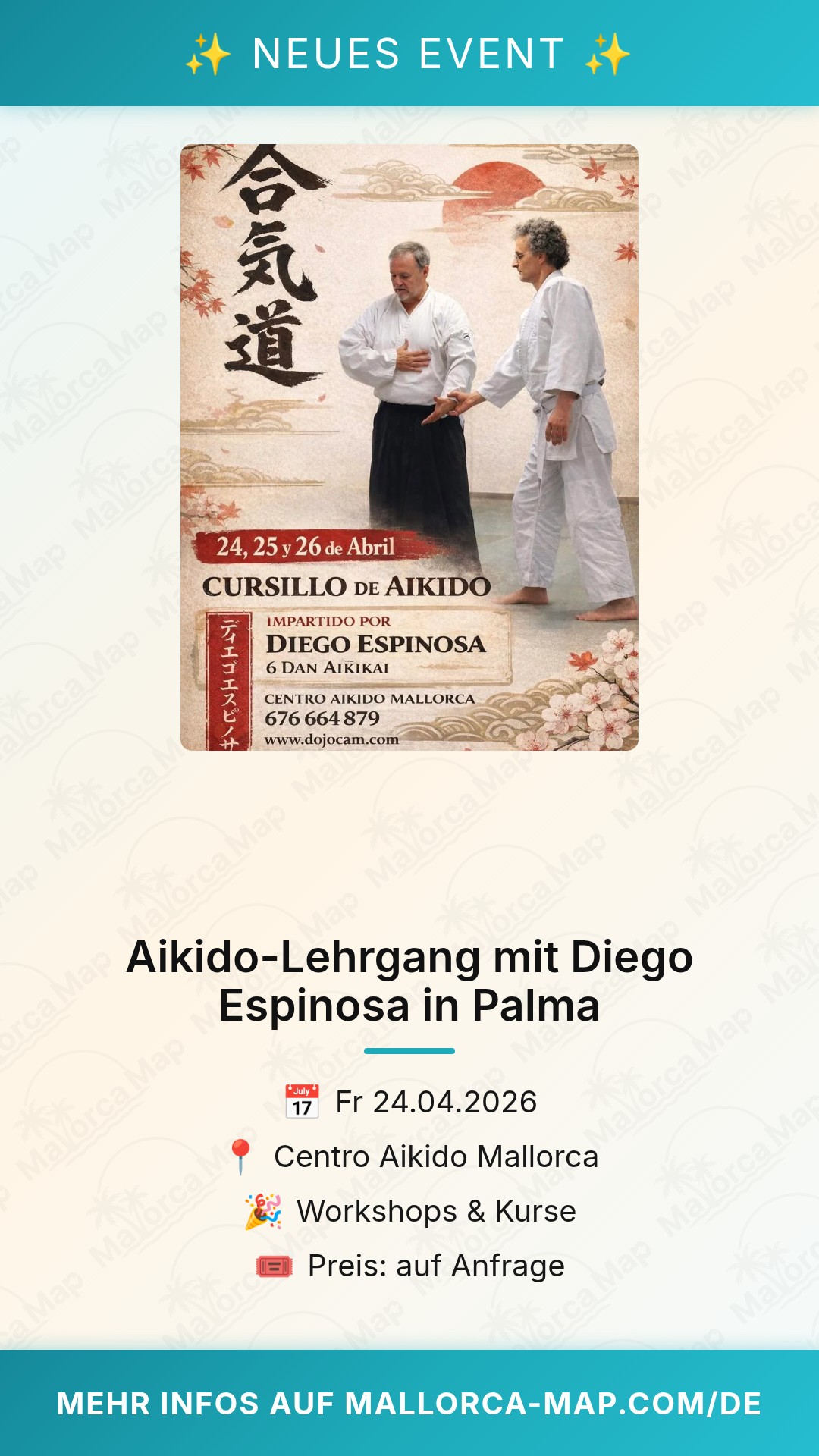 Nutze die Chance, von einem der profiliertesten Lehrer der Region zu lernen. Palma bietet dir nach dem Training zudem die perfekte Kulisse, um den Tag ausklingen zu lassen. Da der Lehrgang direkt in der Stadt stattfindet, kannst du die Trainingseinheiten ideal mit einem Besuch in der Altstadt oder einem entspannten Abendessen am Hafen kombinieren. Pack deinen Keikogi ein und bereite dich auf einen inspirierenden Tag voller Energie und neuer Erkenntnisse vor. Wir freuen uns darauf, dich auf der Matte zu sehen und gemeinsam mit Diego Espinosa die Faszination des Aikido zu erleben.