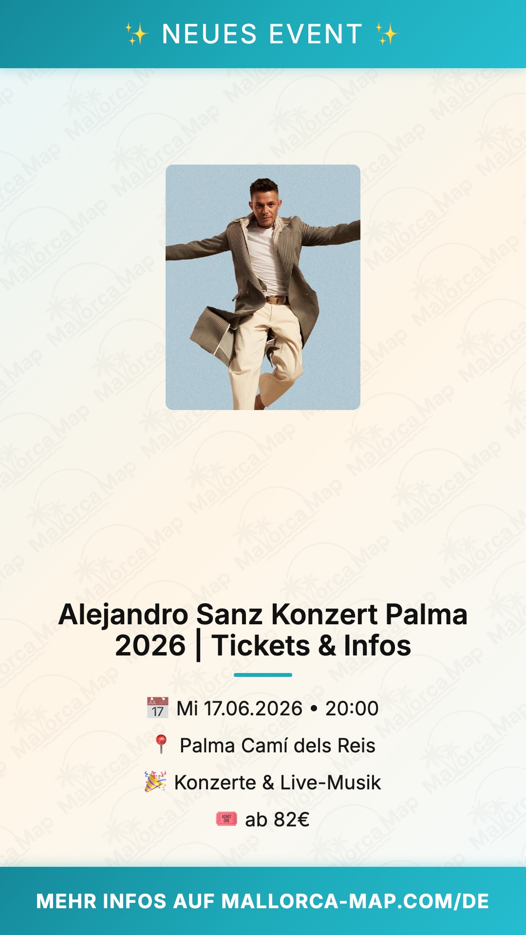 Du erlebst Alejandro Sanz Live am 17. Juni 2026 um 20 Uhr im ikonischen Son Moix Stadion in Palma. Der spanische Superstar bringt seinen Sommerhit nach Mallorca und feiert mit dir seine unvergesslichsten Erfolge in einer explosiven Show. Unter dem offenen Himmel des Stadions, umgeben von der pulsierenden Energie der Insel, wird es eine Nacht voller Emotionen und purer Leidenschaft. Palma Camí dels Reis wird zum Treffpunkt für Fans aus aller Welt, die auf größte Hits wie Volver a Amar oder Corazón Partío warten.
