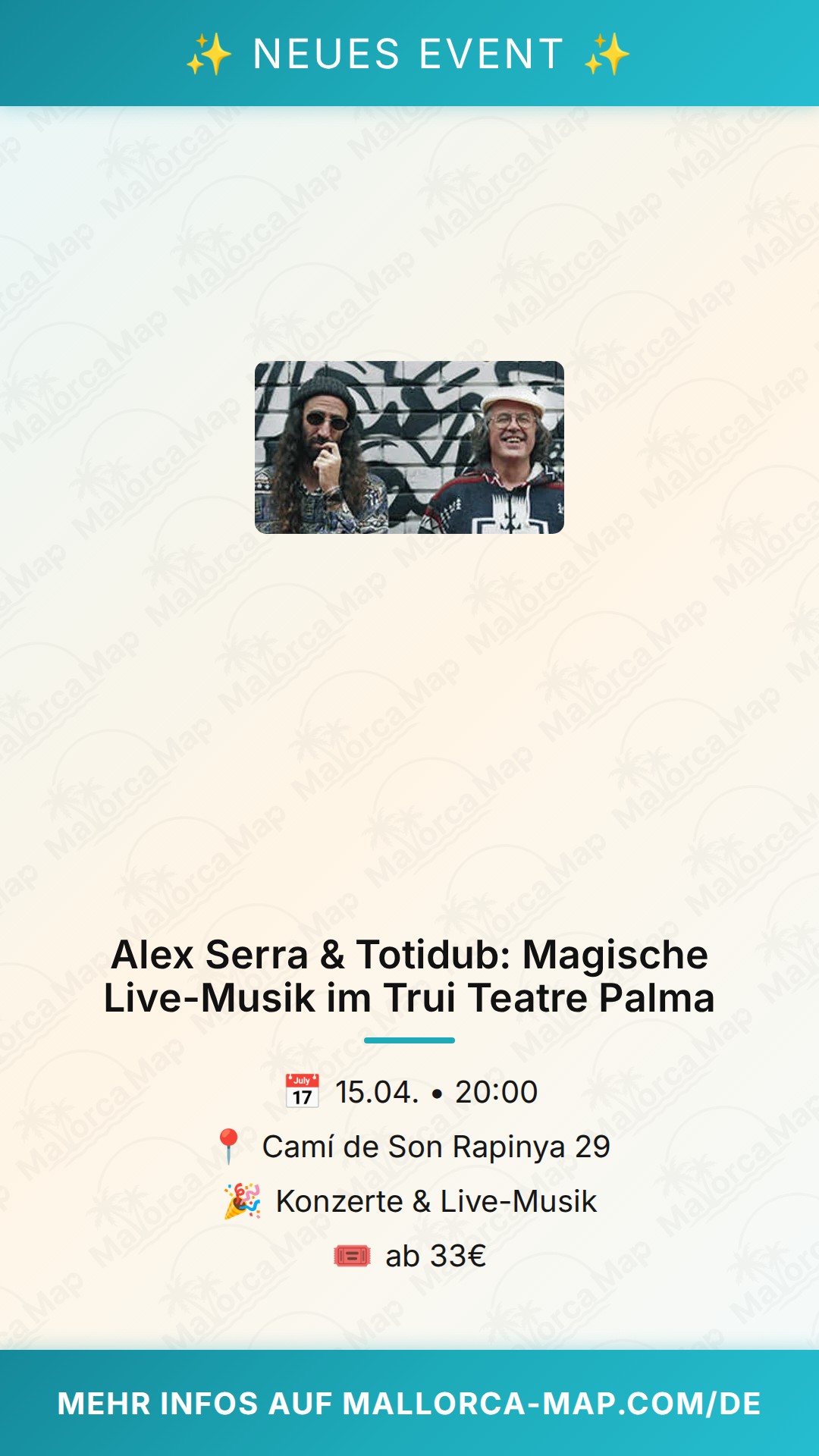 Palma beweist einmal mehr, dass es weit mehr zu bieten hat als nur Strand und Sonne – es ist ein lebendiger Ort für zeitgenössische Musik und kreativen Austausch. Lass dir diese besondere Darbietung nicht entgehen, bei der sich handgemachte Musik und moderne Produktion auf Augenhöhe begegnen. Ob du bereits ein Fan von Alex Serras Werk bist oder einfach nur Lust auf einen Abend mit anspruchsvoller Live-Musik hast, dieses Konzert wird dich begeistern.