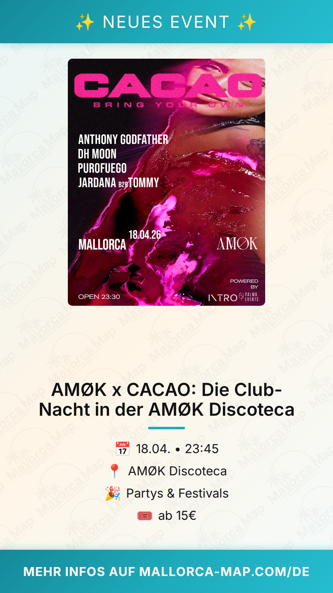 Bist du bereit für eine unvergessliche Nacht in Mallorca? Wenn du elektronische Beats und eine ausgelassene Stimmung liebst, dann solltest du dir das Event AMØK x CACAO in der AMØK Discoteca am 18. April 2026 auf keinen Fall entgehen lassen. Die AMØK Discoteca hat sich längst als feste Größe für alle etabliert, die das pulsierende Nachtleben der Insel in vollen Zügen genießen wollen.