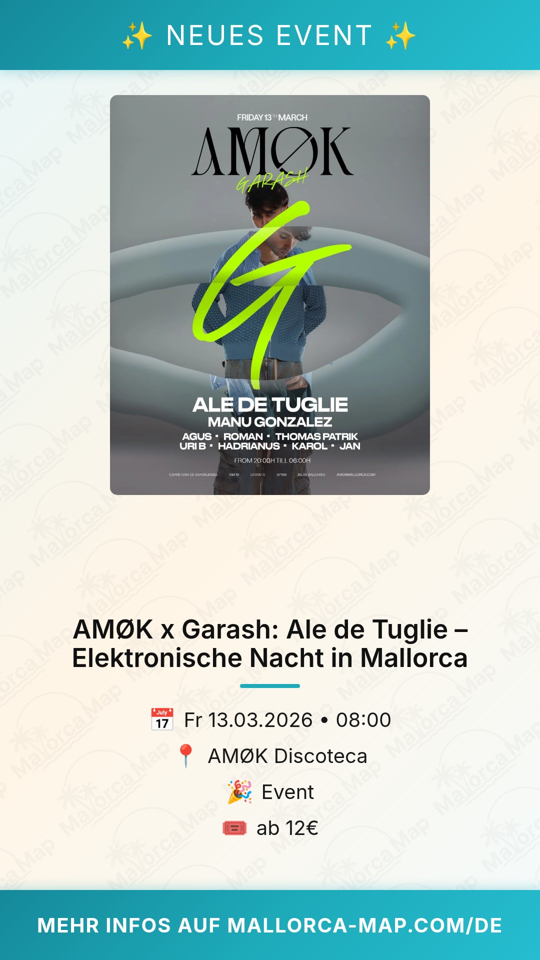 Bist du bereit für eine unvergessliche Nacht auf Mallorca? Am 13. März 2026 erwartet dich im AMØK Discoteca ein echtes Highlight für alle Liebhaber elektronischer Beats. Die exklusive Zusammenarbeit zwischen AMØK und Garash bringt den talentierten DJ Ale de Tuglie auf die Insel und verspricht einen Abend, der deine Erwartungen sprengen wird.