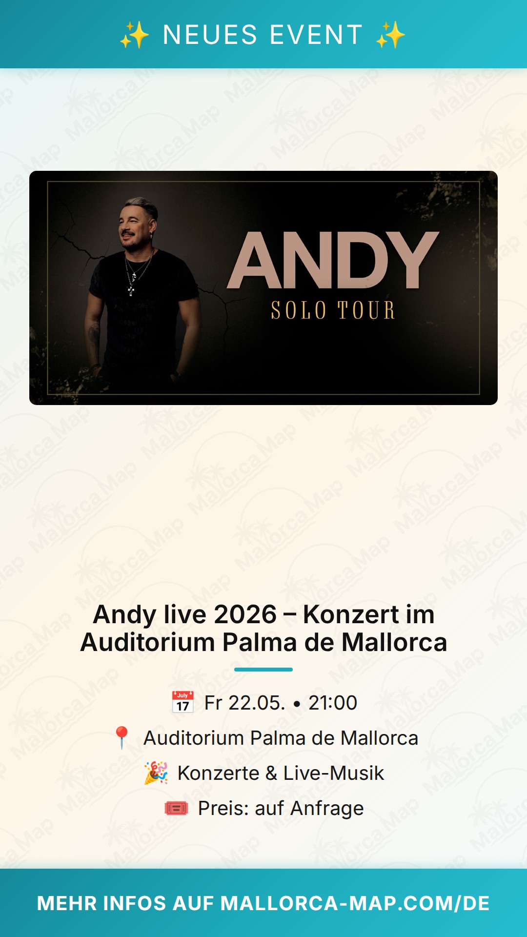 Du erlebst einen besonderen musikalischen Abend, wenn Andy am 22. Mai 2026 die Bühne des Auditorium Palma de Mallorca betritt. Direkt an der malerischen Hafenpromenade von Palma, der Avenida Gabriel Roca, erwartet dich ein Live-Konzert, das Emotionen und erstklassige Unterhaltung vereint. Die Frühlingsluft im Mai bildet den perfekten Rahmen für dieses kulturelle Highlight in der Inselhauptstadt, das Musikfans aus der ganzen Region anzieht.