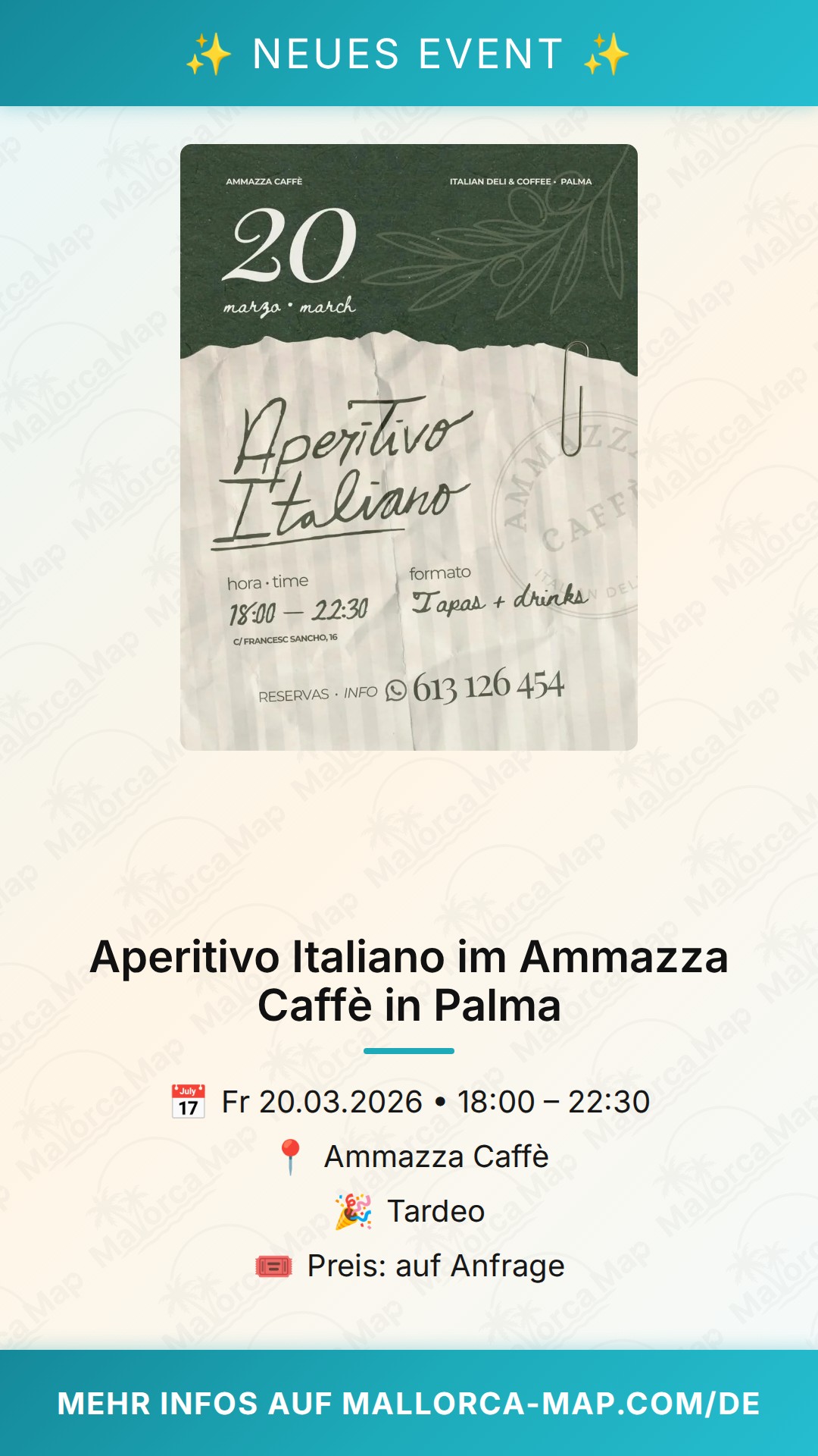 Lust auf ein Stück Italien mitten in Palma? Wenn die Sonne langsam tiefer steht und der Feierabend ruft, gibt es kaum etwas Besseres als einen authentischen Aperitivo Italiano. Am 20. März verwandelt sich das Ammazza Caffè in der Carrer de Francesc Sancho in den perfekten Treffpunkt für alle, die das italienische Lebensgefühl lieben. Du bist herzlich eingeladen, in entspannter Atmosphäre den Tag ausklingen zu lassen und dich auf das bevorstehende Wochenende einzustimmen.