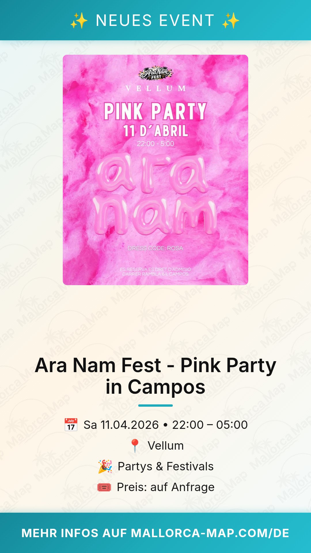 Campos, im Südosten Mallorcas gelegen, beweist mit dem Ara Nam Fest einmal mehr, dass man für erstklassiges Nightlife nicht immer bis nach Palma fahren muss. Hier trifft lokale Leidenschaft auf professionelle Eventplanung. Schnapp dir deine Freunde, wirf dich in Schale und bereite dich auf eine Nacht vor, die du so schnell nicht vergessen wirst. Wir sehen uns auf der Tanzfläche im Vellum – natürlich in Pink! Ob du nun ein Einheimischer bist oder gerade deinen Urlaub auf der Insel verbringst, diese Party bietet die perfekte Gelegenheit, die mallorquinische Feierkultur hautnah zu erleben.