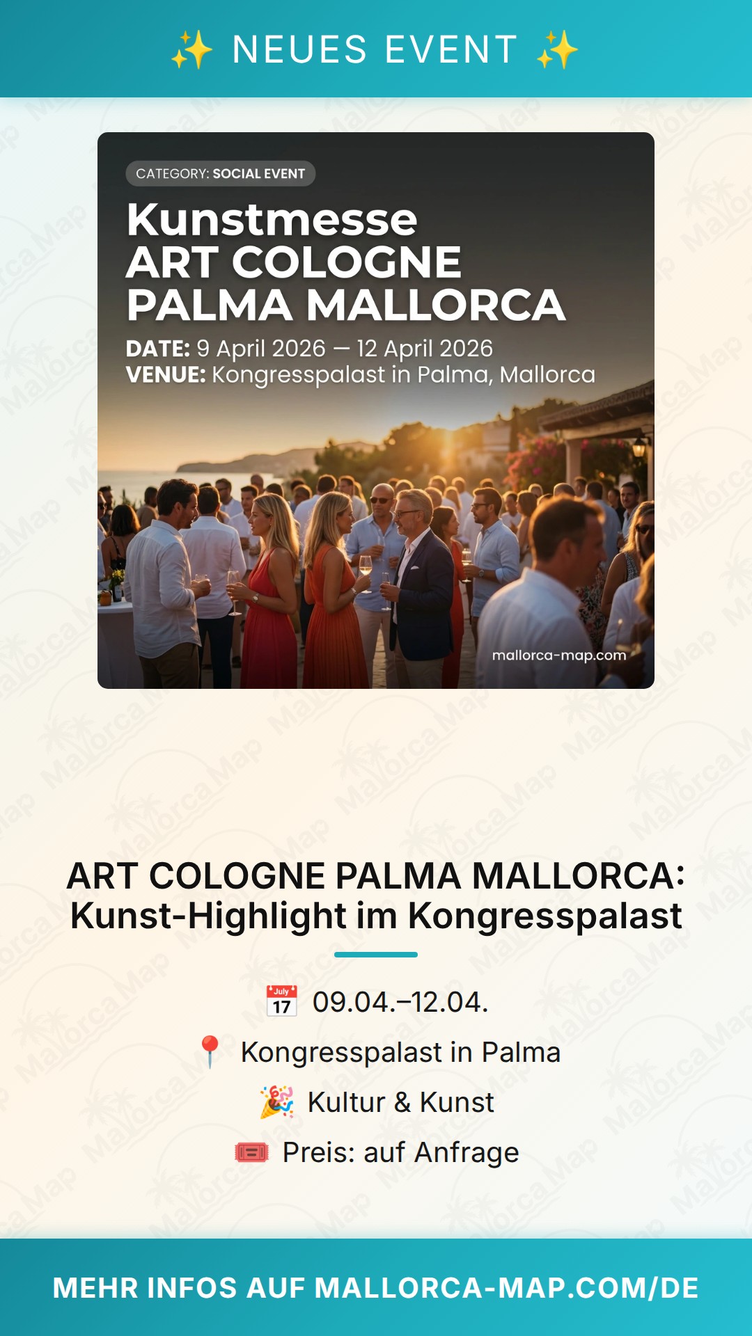 Erlebe vom 9. April 2026 an ein außergewöhnliches kulturelles Ereignis in Palma: Die ART COLOGNE kommt nach Mallorca! Der Kongresspalast in Palma verwandelt sich in dieser Zeit in einen pulsierenden Treffpunkt für Kunstliebhaber, Sammler und Kreative aus ganz Europa. Wenn du dich für zeitgenössische Kunst begeisterst, ist dieser Besuch ein absolutes Muss in deinem Veranstaltungskalender.