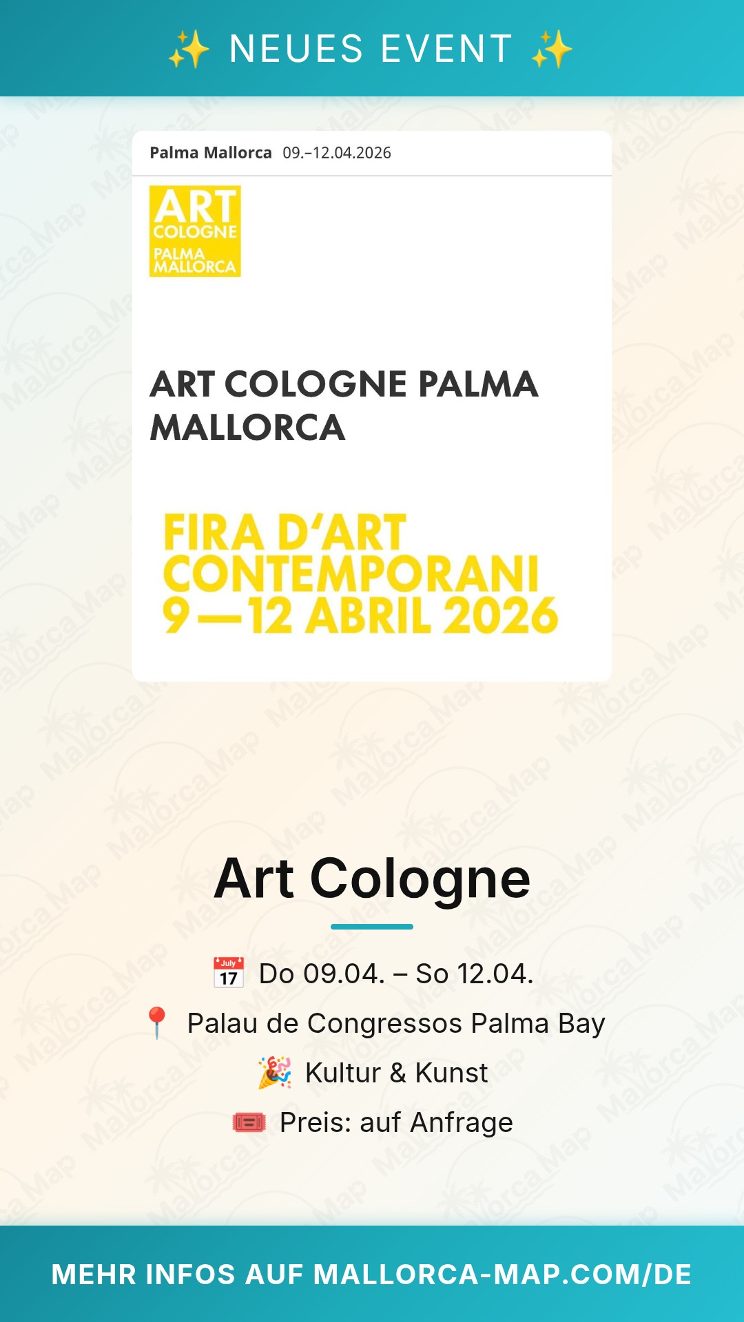Du tauchst ein in die faszinierende Welt der zeitgenössischen Kunst, wenn die Art Cologne am 9. April 2026 ihre Pforten im beeindruckenden Palau de Congressos Palma Bay öffnet. Dieses hochkarätige Event bereichert den Kalender für Events & Partys in Palma um eine kulturelle Facette von internationalem Rang. In der Carrer de Felicià Fuster 2 erwartet dich eine sorgfältig kuratierte Auswahl an Werken, die die Grenzen der Kreativität neu definieren. Die frühlingshafte Atmosphäre Mallorcas bietet dabei den perfekten Rahmen für diese exklusive Fira d'Art, die Sammler und Ästheten gleichermaßen in ihren Bann zieht.