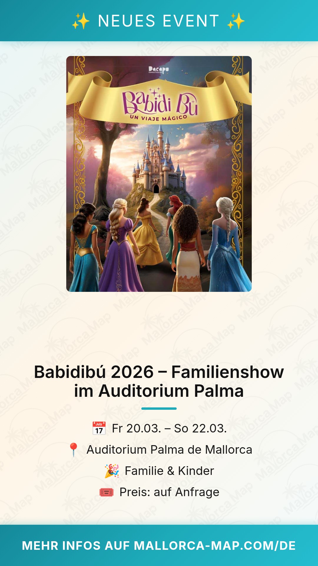 Du erlebst einen unvergesslichen Nachmittag voller Magie und Fantasie, wenn die spektakuläre Show Babidibú am 20. März 2026 die Bühne des Auditorium Palma de Mallorca erobert. Direkt an der malerischen Hafenpromenade, der Avenida Gabriel Roca, erwartet dich ein kulturelles Highlight, das Kinderaugen zum Leuchten bringt und Erwachsene in Staunen versetzt. In der prestigeträchtigen Kulisse des Auditoriums verschmelzen Musik, Licht und Performance zu einem Gesamtkunstwerk, das die Herzen im Sturm erobert. Es ist der perfekte Anlass, um mit der ganzen Familie in eine Welt jenseits des Alltags einzutauchen und die besondere Atmosphäre der Inselhauptstadt Palma zu genießen.