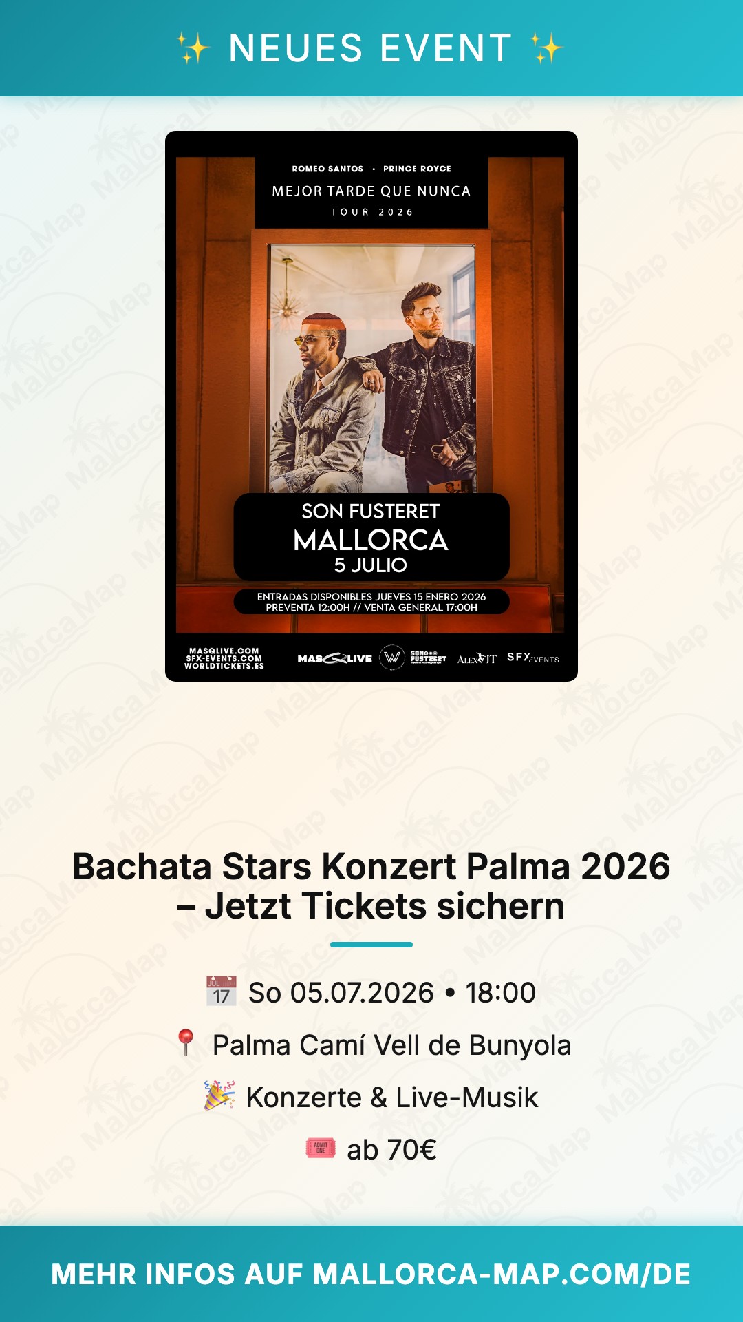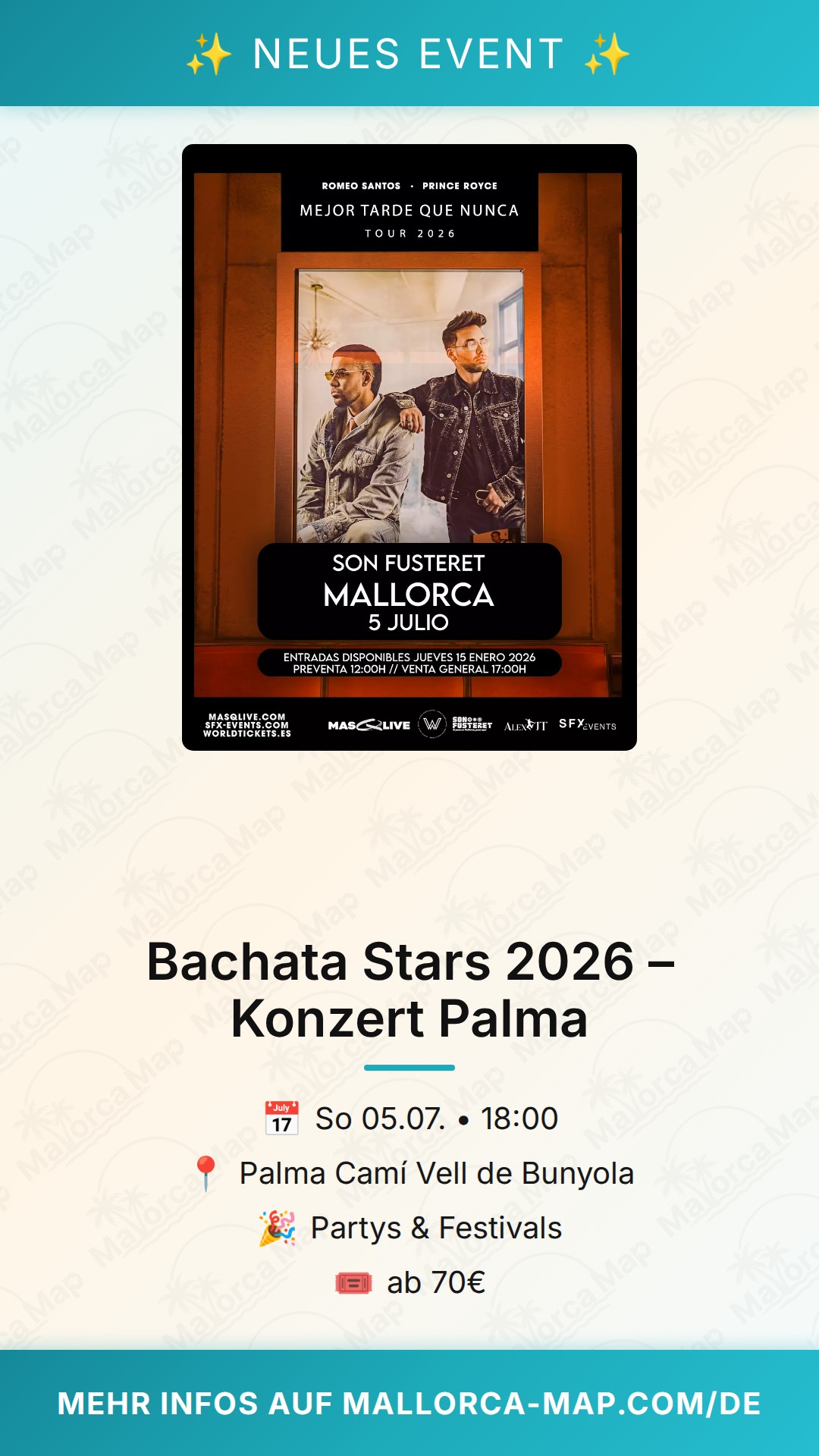Da die Tickets für dieses Event sehr begehrt sind, solltest du nicht zu lange warten. Die Preise liegen im gehobenen Segment, was die Exklusivität dieses Konzerts unterstreicht. Nutze die gute Anbindung von Palma aus, um stressfrei anzureisen. Sichere dir jetzt deinen Platz für das Bachata-Event des Jahres und erlebe einen Sommerabend voller Magie. Wir sehen uns auf der Tanzfläche beim Bachata Stars Konzert – verpass diesen Moment auf keinen Fall!