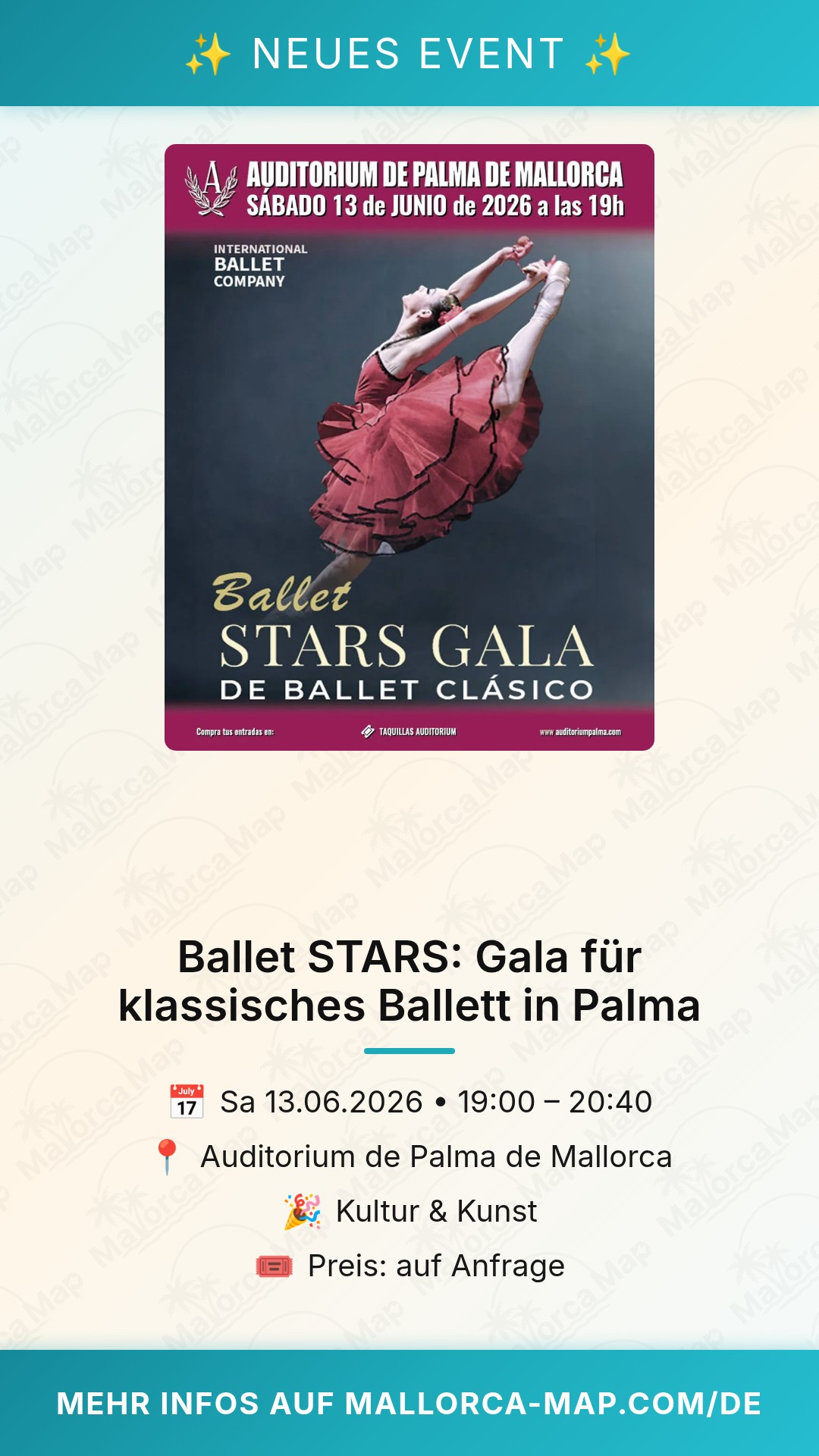 Du liebst die Eleganz und Perfektion des klassischen Tanzes? Dann solltest du dir den 13. Juni 2026 rot im Kalender markieren. Im beeindruckenden Auditorium de Palma de Mallorca erwartet dich ein kulturelles Highlight der Extraklasse: Die "Ballet STARS Gala de Ballet Clásico". Präsentiert von der renommierten International Ballet Company, verspricht dieser Abend eine Reise durch die schönsten Momente der Ballettgeschichte direkt an der Küste Mallorcas.