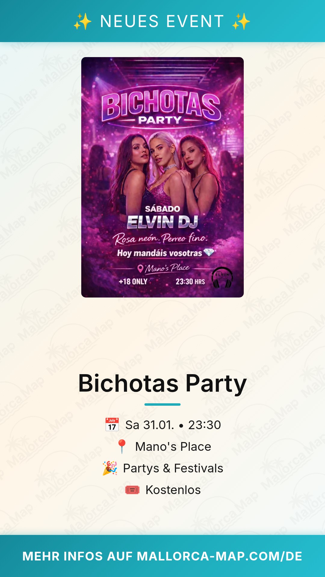 Bereite dich auf die ultimative Nacht vor, denn die Bichotas Party kommt am 31. Januar 2026 nach Palma de Mallorca. Wenn du Lust auf eine unvergessliche Clubnacht mit Reggaeton-Beats hast, bist du hier genau richtig. Diese Veranstaltung verspricht eine energiegeladene Atmosphäre, in der du bis in die frühen Morgenstunden tanzen kannst. Erlebe die besten Hits und lass dich von der einzigartigen Stimmung mitreißen, während du gemeinsam mit anderen Partybegeisterten den Winter in der Inselhauptstadt feierst.
