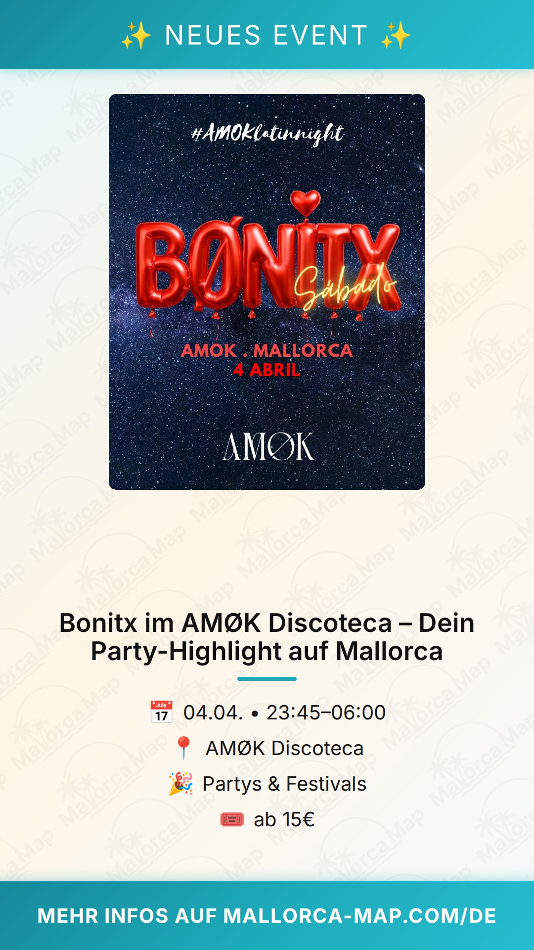 Bist du bereit für eine unvergessliche Nacht auf Mallorca? Dann solltest du dir das Event „Bonitx“ im AMØK Discoteca auf keinen Fall entgehen lassen. Am 4. April 2026 verwandelt sich der Club in den ultimativen Treffpunkt für alle, die das Nachtleben der Insel in vollen Zügen genießen möchten. AMØK hat sich längst als feste Größe in der lokalen Clubszene etabliert und bietet die perfekte Kulisse für eine ausgelassene Stimmung, erstklassige Beats und eine Atmosphäre, in der du einfach loslassen und tanzen kannst.