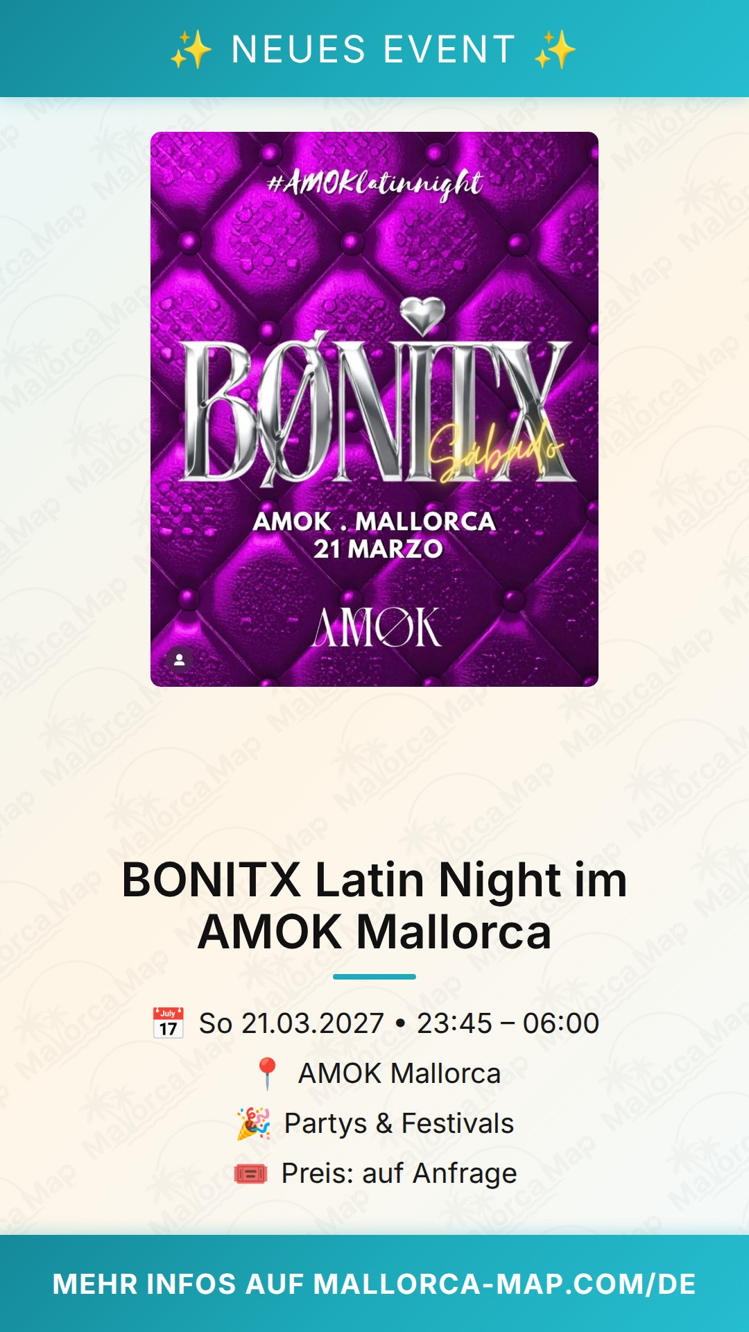 Verpasse nicht die Chance, Teil dieser besonderen Community zu werden. Die Kombination aus erstklassigen DJs, einer top Location und der unverwechselbaren mallorquinischen Nachtluft macht die BONITX Latin Night zu einem Highlight im Frühjahr 2027. Wir sehen uns auf der Tanzfläche im AMOK Mallorca – lass uns gemeinsam die Nacht zum Tag machen und die pure Lebensfreude feiern!