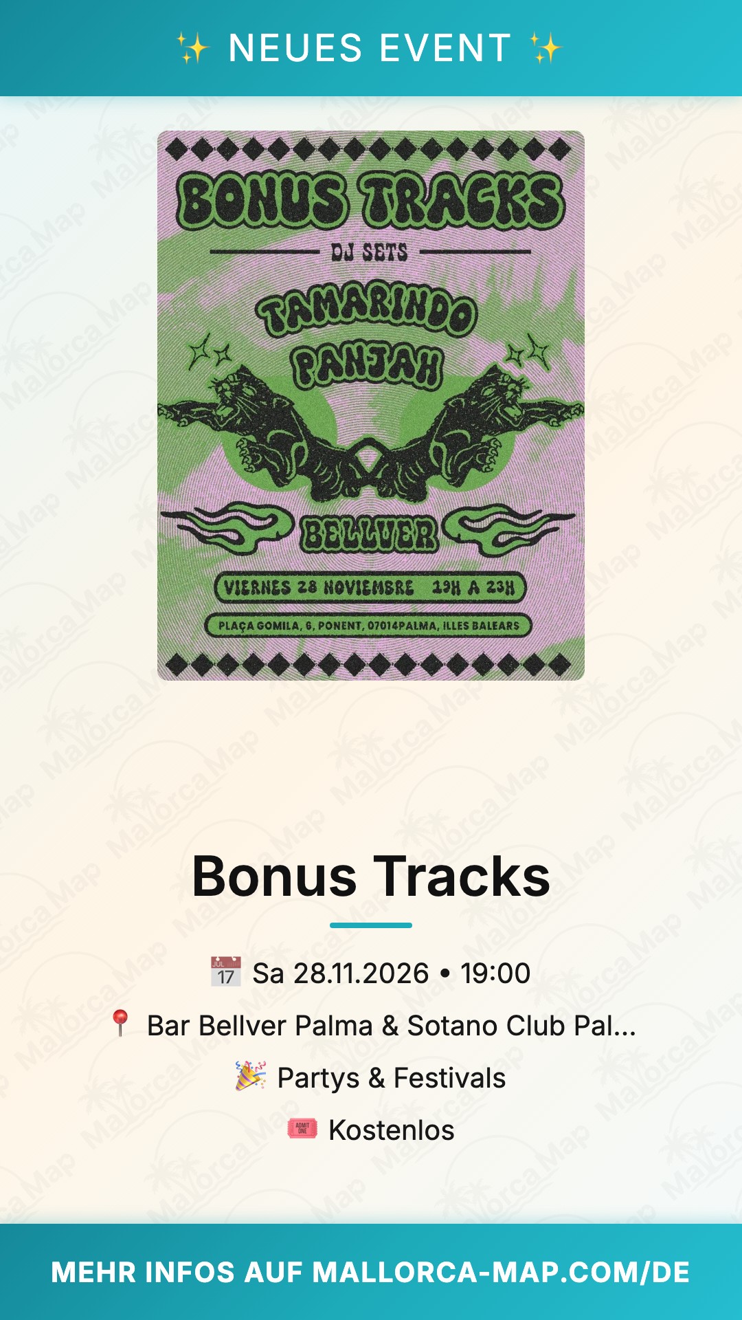 Komm pünktlich um 19 Uhr an, parke in der Nähe oder nutze den Bus aus Palma-Zentrum. Sichere dir den freien Eintritt einfach vor Ort und tauche ein in Mallorcas Party-Szene. Verpasse Bonus Tracks nicht – das wird dein Highlight des Novembers!