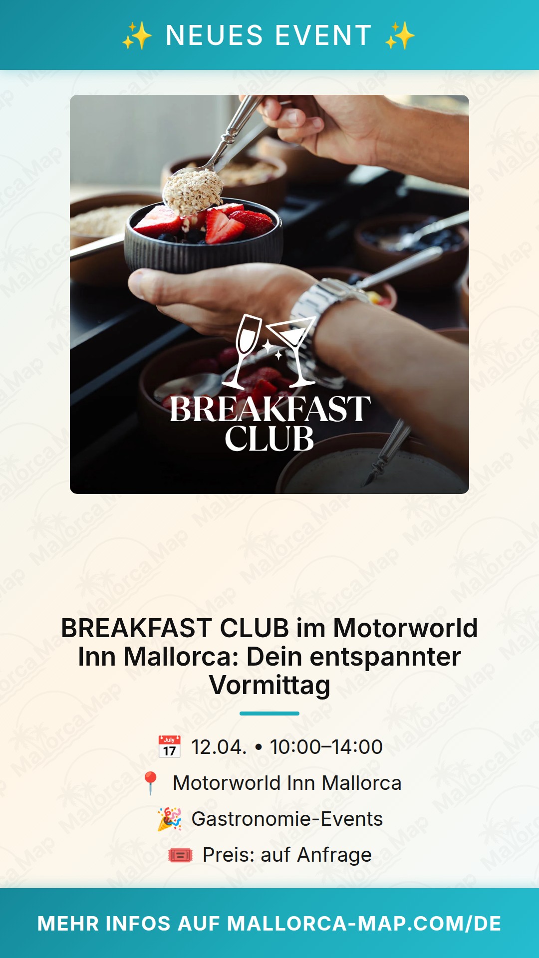 Komm vorbei, bring gute Laune mit und lass dich vom Team des Motorworld Inn verwöhnen. Wir freuen uns darauf, dich beim BREAKFAST CLUB zu sehen und gemeinsam einen wunderbaren Vormittag auf Mallorca zu verbringen. Es ist mehr als nur ein Frühstück – es ist dein Start in ein unvergessliches Wochenende. Markiere dir den Termin im Kalender und sei dabei, wenn es heißt: Genieße den Vormittag bei uns!