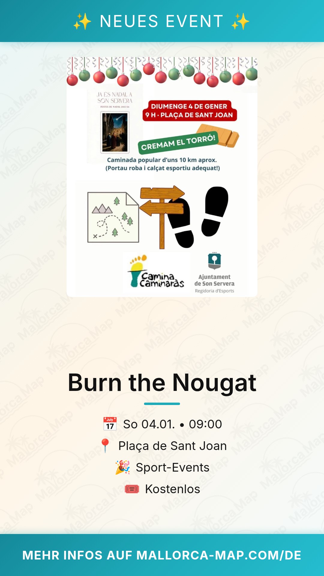 Das Motto „Cremam el torró“ – zu Deutsch: „Wir verbrennen den Nougat“ – ist eine humorvolle Anspielung auf die süßen Sünden der Weihnachtszeit. Bei diesem Sport-Event steht jedoch nicht der Leistungsgedanke im Vordergrund, sondern der Spaß an der Bewegung und das Erleben der Natur rund um Son Servera. Die Route führt dich durch typisch mallorquinische Gassen und hinaus in die sanfte Hügellandschaft der Region Llevant. Du atmest die klare, frische Luft ein und lässt dich von der besonderen Atmosphäre anstecken, wenn Hunderte von Menschen gemeinsam wandern oder joggen. Ein Highlight ist der Zieleinlauf, bei dem die Freude über die geschaffte Strecke und das gemeinsame Erlebnis im Mittelpunkt steht.