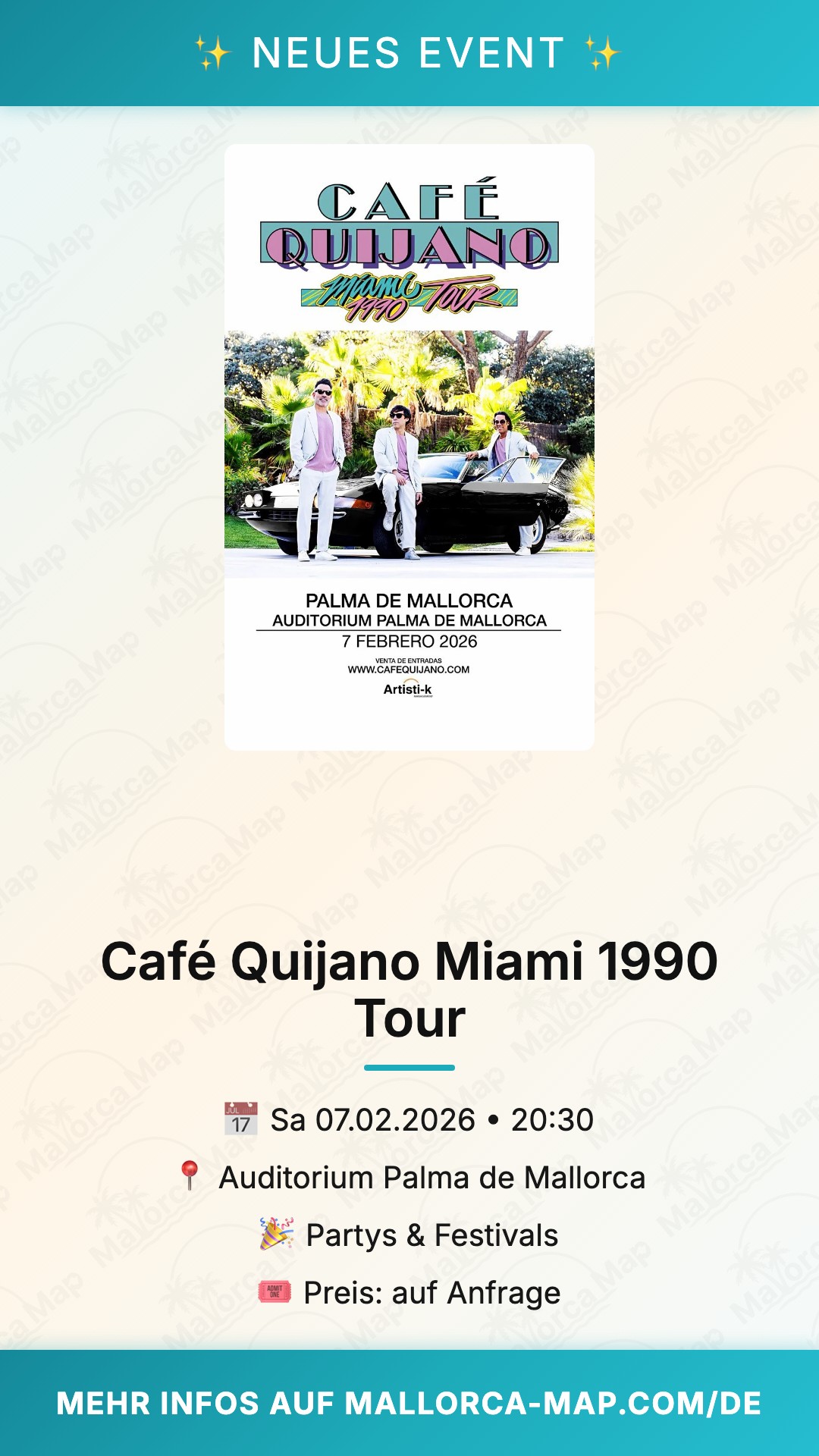 Komm pünktlich, park nah oder nutze öffentliche Verkehrsmittel – Palma ist easy erreichbar. Sichere dir jetzt deinen Platz für dieses Highlight der Saison und lass dich von Café Quijano verzaubern!