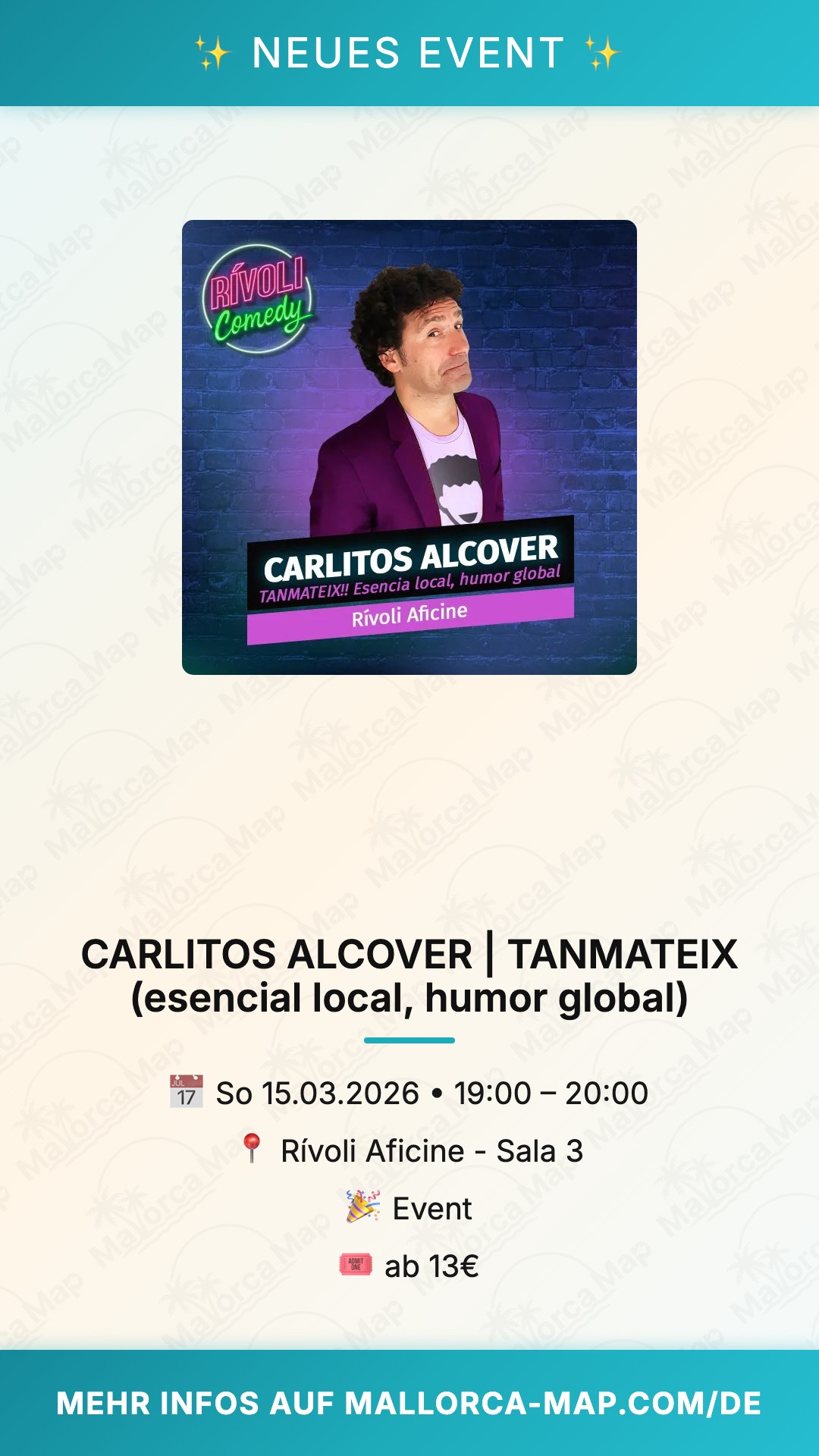 Bist du bereit für einen Abend voller Lachen? Am 15. März 2026 bringt der bekannte Comedian Carlitos Alcover sein neuestes Programm „Tanmateix“ auf die Bühne des Rívoli Aficine in Palma. Diese Show kombiniert lokale Essenzen mit globalem Humor und verspricht ein Highlight im mallorquinischen Kulturkalender zu werden. Wenn du Lust auf scharfzüngige Beobachtungen und eine ordentliche Portion Selbstironie hast, solltest du dir diesen Termin in der Inselhauptstadt auf keinen Fall entgehen lassen.