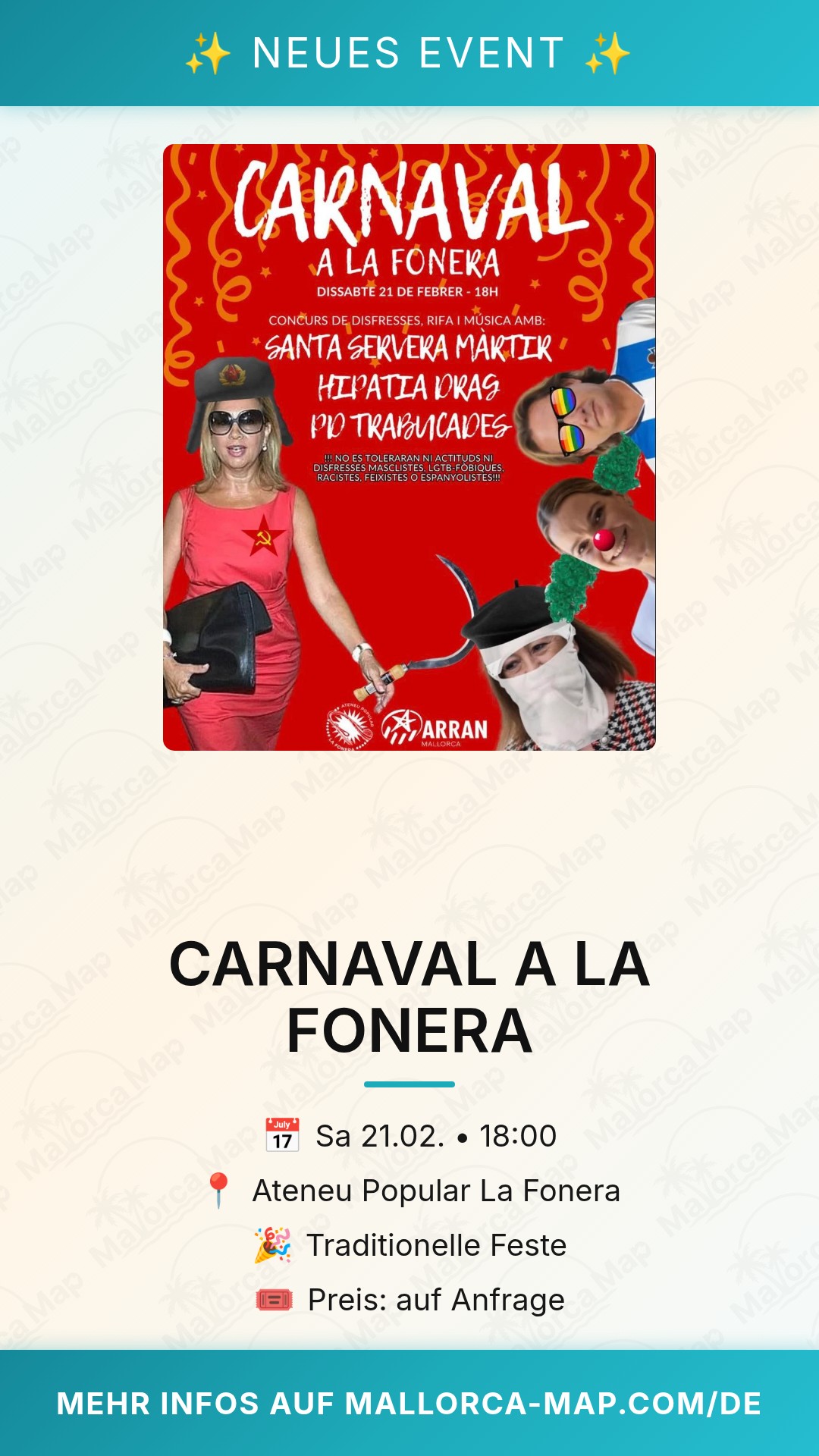Dieses Event richtet sich an alle, die das Leben feiern wollen – egal ob du ein eingefleischter Karnevalsfan bist oder einfach nur eine gute Zeit mit Freunden verbringen möchtest. Wenn du die mallorquinische Nachtkultur liebst und gerne neue Leute in einer entspannten Umgebung kennenlernst, wirst du dich hier pudelwohl fühlen. Es ist ein Treffpunkt für Jung und Alt, bei dem die Freude am Verkleiden und Tanzen im Vordergrund steht. Auch für Urlauber, die Mallorca abseits der typischen Touristenpfade erleben wollen, bietet der Carnaval a la Fonera einen authentischen Einblick in das lokale Freizeitleben. Du musst kein Spanisch sprechen, um die universelle Sprache des Feierns zu verstehen.