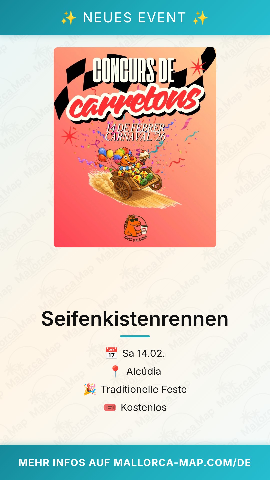 Du erlebst am 14. Februar 2026 ein ganz besonderes Spektakel, wenn das traditionsreiche Seifenkistenrennen Alcúdia die historischen Gassen der Stadt in eine Rennstrecke verwandelt. Im Rahmen der bunten Karnevals-Feierlichkeiten zieht dieses Event Einheimische und Besucher gleichermaßen an, um die kreativen und oft waghalsigen Konstruktionen der Teilnehmer zu bewundern. Die Atmosphäre in Alcúdia auf Mallorca ist an diesem Tag geprägt von Lachen, Musik und dem sportlichen Ehrgeiz der Teams, die ihre selbstgebauten Gefährte geschickt durch den Parcours manövrieren.