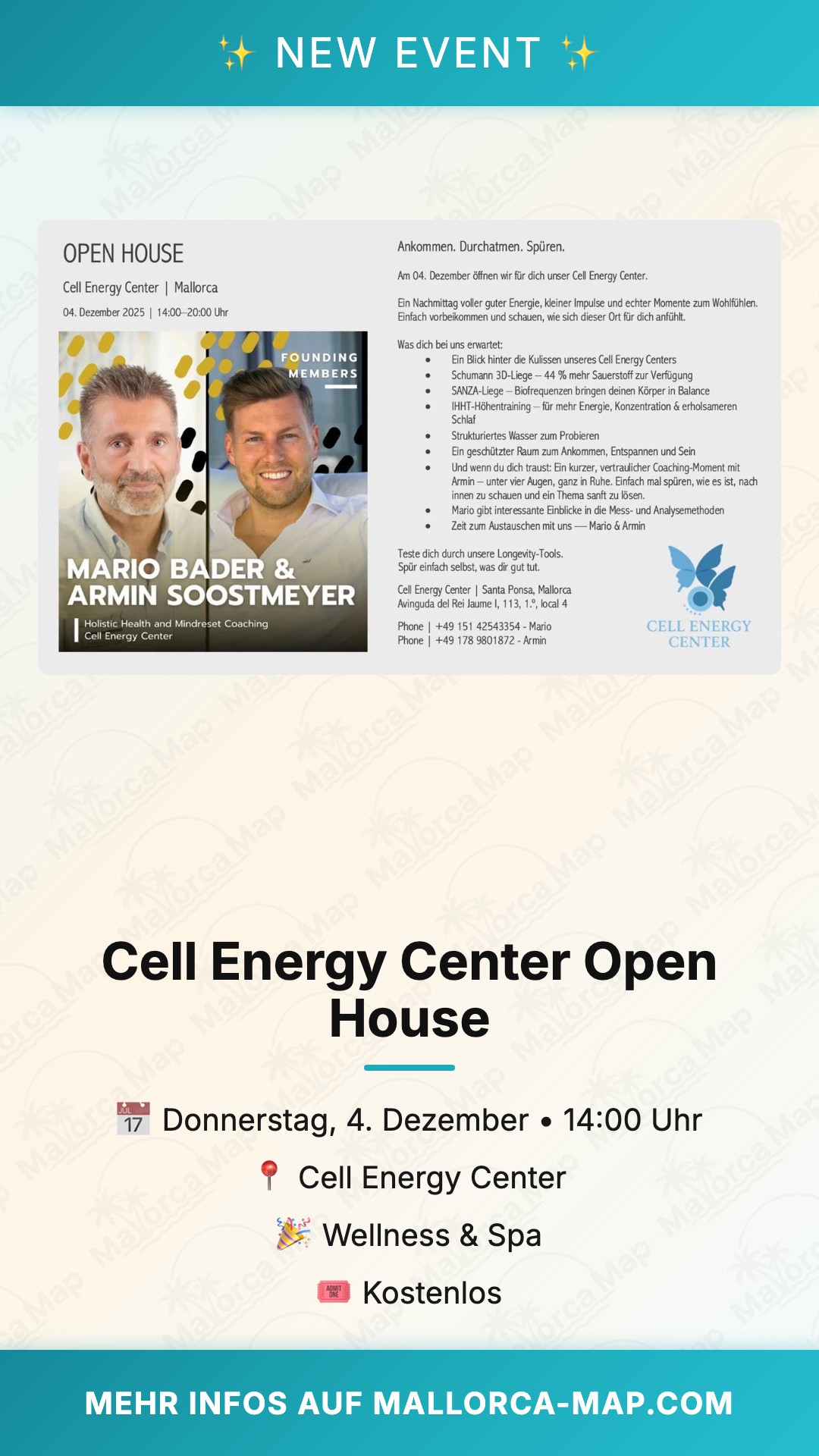 Plane deinen Besuch: Ruf unter +34 971 517 114 oder +34 871 807 872 an für Details. Komm vorbei, teste dich selbst und nimm frische Energie mit – das Open House im Cell Energy Center wird dein Wellness-Highlight auf Mallorca!