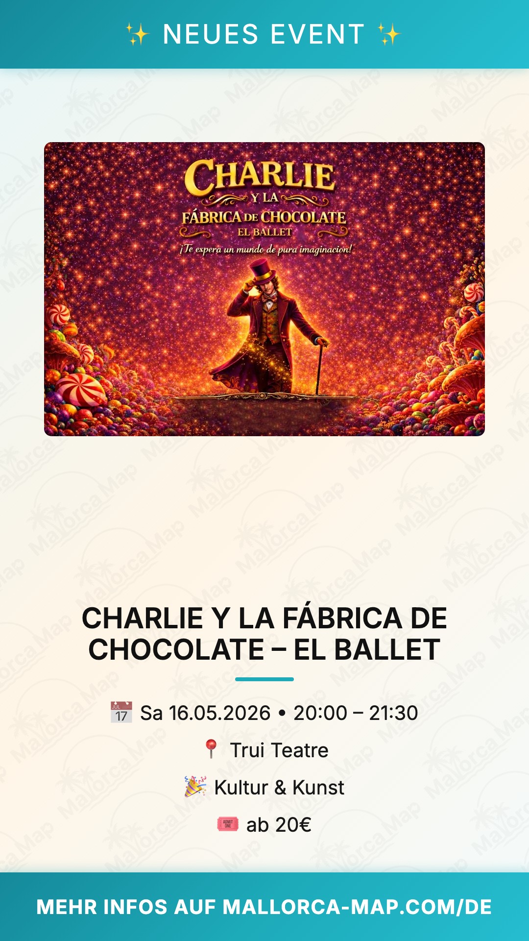 Du suchst nach einem magischen Erlebnis im Mai? Dann ist das Ballet Charlie und die Schokoladenfabrik im Trui Teatre in Palma genau das Richtige für dich. Am 16. Mai 2026 verwandelt sich die Bühne in ein fantastisches Universum voller Tanz und Emotionen. Lass dich von dieser einzigartigen choreografischen Neuinterpretation verzaubern, die den zeitlosen Klassiker in einer modernen Form zum Leben erweckt. Erlebe eine Show, bei der Fantasie und Bewegung im Mittelpunkt stehen und dich in eine Welt voller Wunder entführen.