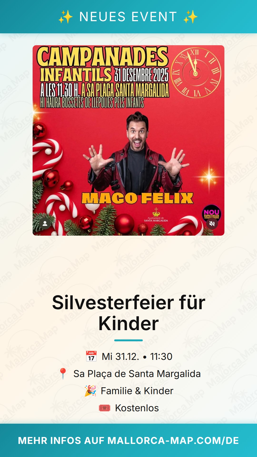 Dieses Event ist ideal für Familien mit Kindern jeden Alters, die den Silvestertag entspannt und fröhlich beginnen möchten. Die Atmosphäre in Santa Margalida ist authentisch und herzlich, fernab vom großen Trubel der touristischen Zentren. Hier spürst du die echte Gastfreundschaft Mallorcas, während die Kinder sicher auf dem Platz spielen und das Programm genießen können. Es ist die perfekte Gelegenheit, lokale Bräuche kennenzulernen und gemeinsam mit anderen Familien in das neue Jahr hineinzufeiern, ohne dass die Kleinen bis spät in die Nacht wach bleiben müssen.