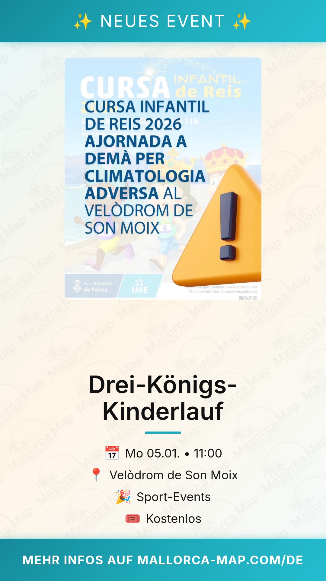 Du startest sportlich und voller Vorfreude in das neue Jahr beim Drei-Königs-Kinderlauf in Palma de Mallorca. Am Vormittag des 5. Januar 2026 verwandelt sich das Gelände rund um den Camí dels Reis in eine Arena für kleine Sportler. Während die ganze Insel auf die Ankunft der Heiligen Drei Könige wartet, steht hier der Spaß an der Bewegung im Mittelpunkt. Das Event im Velòdrom de Son Moix ist längst eine feste Tradition im Veranstaltungskalender der Inselhauptstadt und bietet die perfekte Gelegenheit für Familien, die festliche Stimmung mit sportlichem Ehrgeiz zu verbinden.