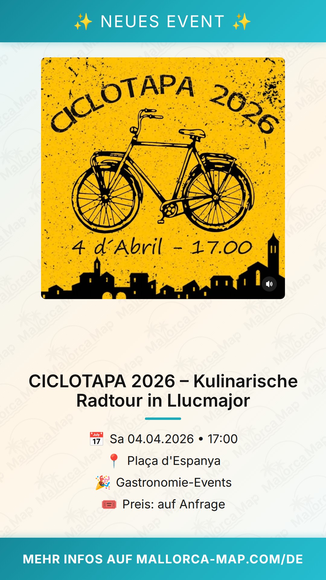 Bist du bereit für ein Event, das Bewegung und Genuss auf einzigartige Weise verbindet? Die CICLOTAPA 2026 in Llucmajor ist genau das Richtige für dich, wenn du die mallorquinische Lebensart liebst. Am Samstag, den 4. April 2026, dreht sich in den Gassen von Llucmajor alles um zwei Dinge: Fahrräder und fantastische Tapas.