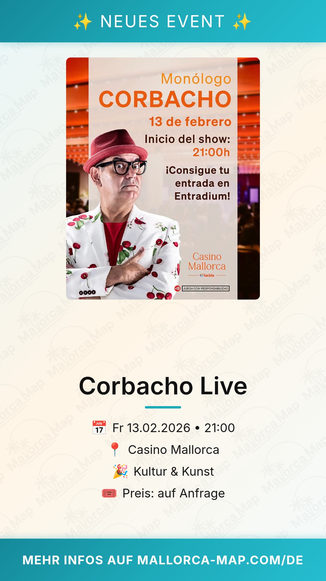 Du erlebst am Freitag, den 13. Februar 2026, einen Abend der Extraklasse, wenn Corbacho Live die Bühne des legendären Casino Mallorca in Palma erobert. In der exklusiven Atmosphäre des Porto Pi Centro, direkt an der Avinguda de Gabriel Roca gelegen, erwartet dich eine Stand-up Comedy Show, die kein Auge trocken lässt. José Corbacho, bekannt für seinen scharfzüngigen Humor und seine unvergleichliche Bühnenpräsenz, bringt sein neuestes Programm direkt in das pulsierende Herz der Inselhauptstadt. Es ist die perfekte Gelegenheit, den stressigen Alltag hinter sich zu lassen und in eine Welt voller Lachen, Ironie und erstklassigem Entertainment einzutauchen, während die Lichter des Hafens von Palma de Mallorca im Hintergrund glitzern.