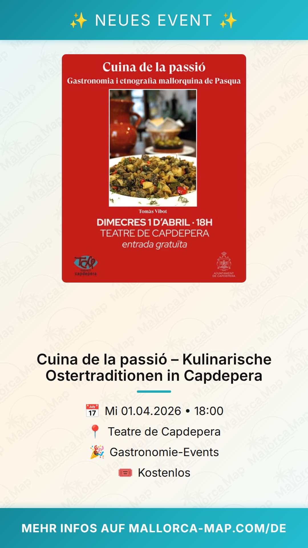 Pack deine Neugier ein und komm am späten Nachmittag nach Capdepera. Los geht es um 18:00 Uhr. Es ist eine wunderbare Chance, mit Einheimischen in Kontakt zu kommen und mehr über die Seele der mallorquinischen Küche zu erfahren. Wir sehen uns im Teatre de Capdepera zur „Cuina de la passió“ – ein Fest für die Sinne und den Geist, das du nicht verpassen solltest!