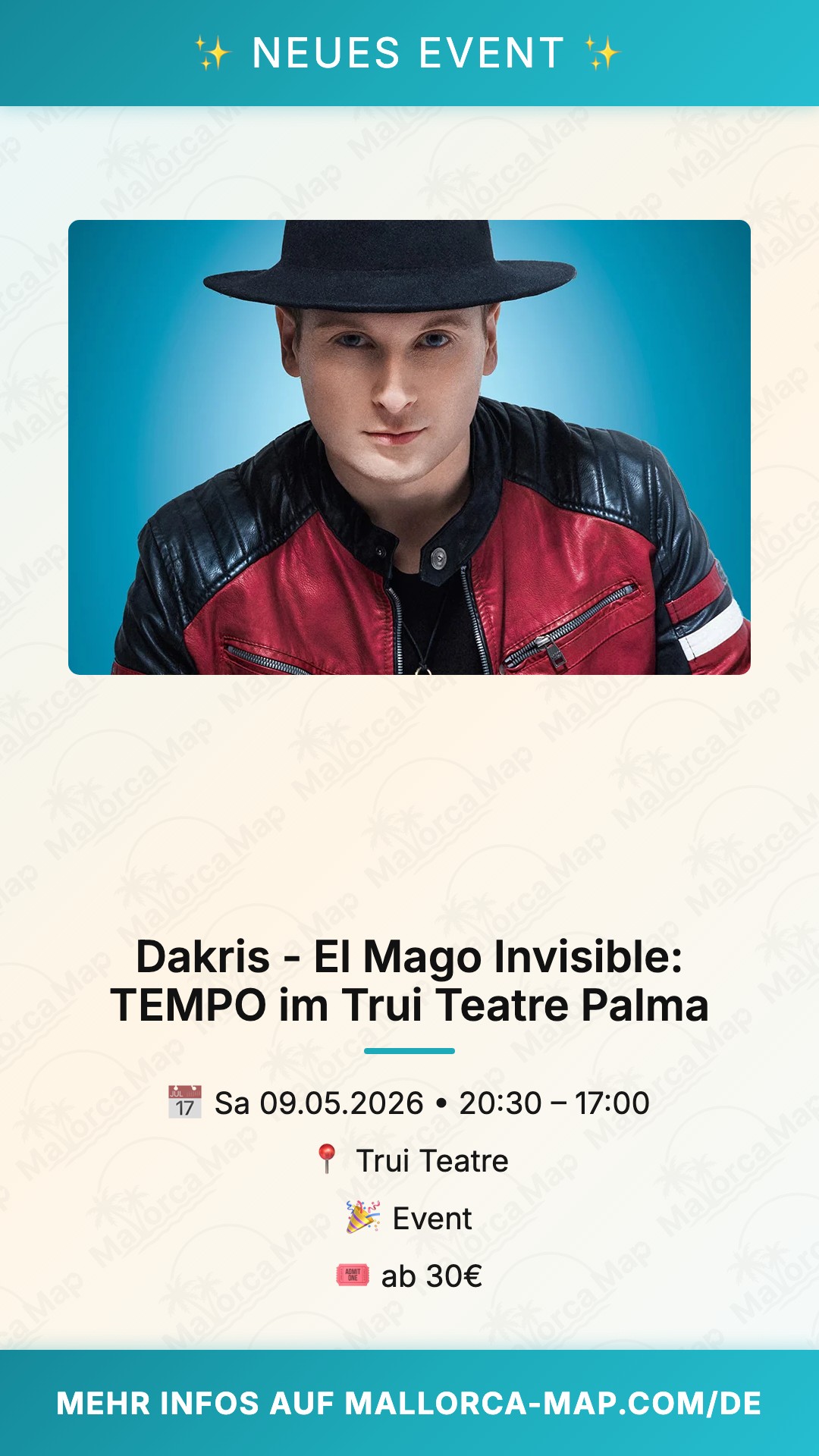 Sichere dir am besten frühzeitig deinen Platz, da die Shows von Dakris oft schnell ausverkauft sind. Die Anreise zum Trui Teatre ist unkompliziert, und es gibt ausreichend Parkmöglichkeiten in der direkten Umgebung. Nutze die Chance, diesen Ausnahmekünstler live in Palma zu erleben und dich von seinem Talent überzeugen zu lassen. Pack deine Freunde ein und tauche ein in die Welt des Unsichtbaren. Wir sehen uns im Mai – lass dich von der Magie verzaubern und genieße einen Abend voller Staunen, Lachen und magischer Wunder, die du so schnell nicht vergessen wirst.