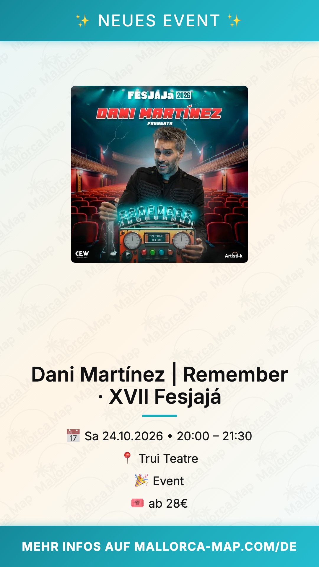 Da die Auftritte von Dani Martínez erfahrungsgemäß sehr beliebt sind und die Nachfrage nach Tickets hoch ist, solltest du nicht zu lange zögern und dir deinen Platz für dieses kulturelle Highlight im Herbst rechtzeitig reservieren. Das Theater ist bequem zu erreichen und bietet dir die Möglichkeit, einen entspannten Abend in Palma mit einem echten Kracher zu krönen. Pack deine Freunde ein und bereite dich auf eine Show vor, die dich noch lange nach dem Schlussvorhang zum Schmunzeln bringen wird – wir sehen uns im Trui Teatre.