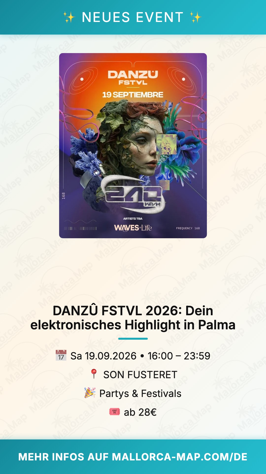 Sichere dir rechtzeitig deine Tickets, die bereits ab 28 € erhältlich sind. Da solche elektronischen Highlights auf der Insel erfahrungsgemäß schnell vergriffen sind, solltest du nicht zu lange zögern. Schnapp dir deine Crew, genieße die unvergleichliche Stimmung und werde Teil einer unvergesslichen Nacht in Palma. Wir sehen uns auf dem Dancefloor bei den Waves of Life!