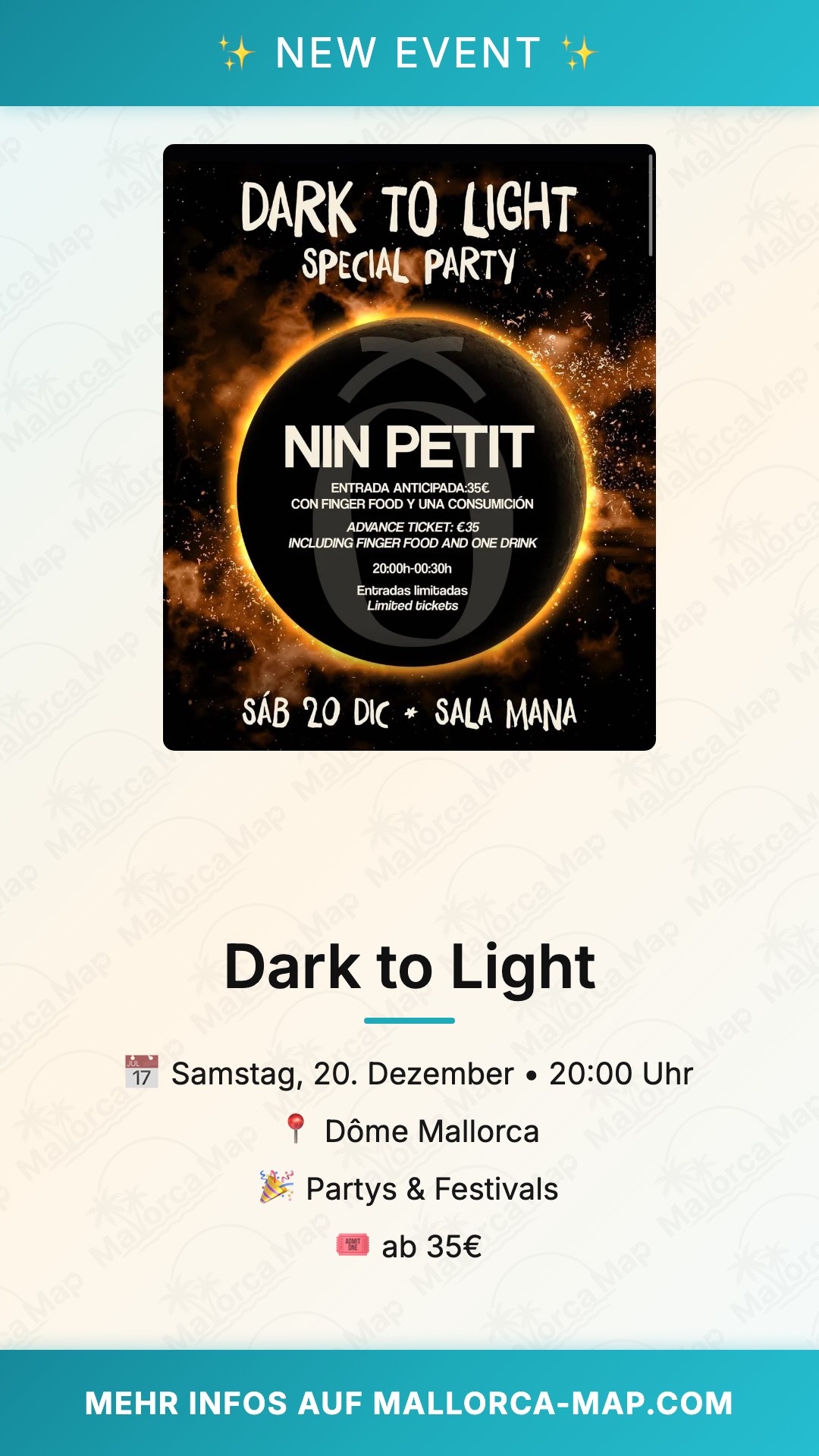 Die Dark to Light Special Party im Dôme Mallorca lädt dich am 20. Dezember 2025 zu einem unvergesslichen Abend ein, der die Wintersonnenwende in Szene setzt. Starte um 20 Uhr in eine Welt aus kontrastreichen Sounds und Lichtern, wo Nin Petit mit ihrem DJ-Set die Nacht erhellt. Das exklusive Event inklusive Finger Food und einer Consumición macht den Einstieg perfekt, während limited Tickets für eine intime, pulsierende Atmosphäre sorgen. In der eleganten Kulisse des Dôme Mallorca spürst du die Magie Mallorcas, wo der Übergang von Dunkel zu Licht buchstäblich greifbar wird.
