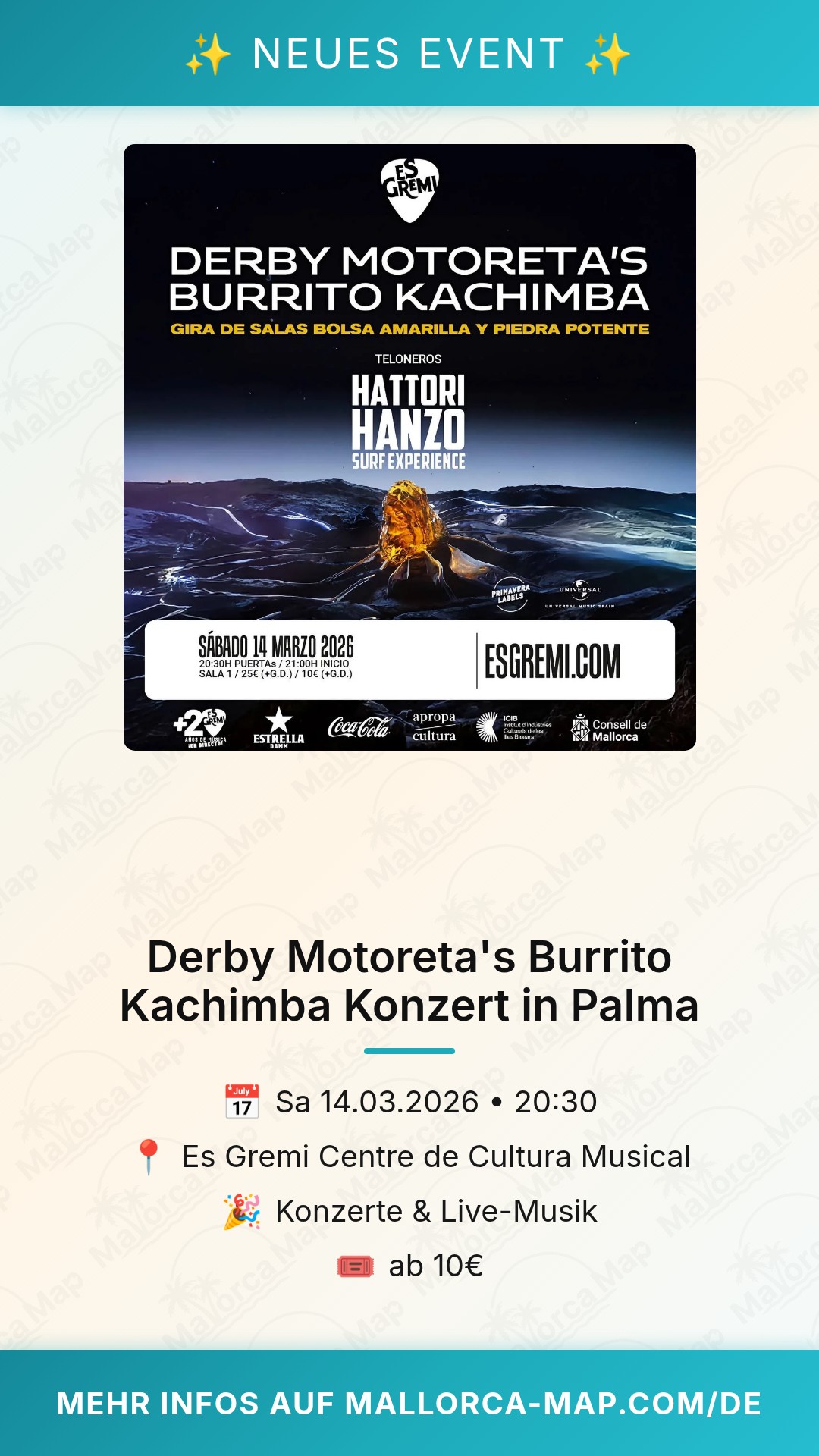 Die Türen öffnen sich bereits um 20:30 Uhr, sodass du genug Zeit hast, dir ein Kaltgetränk an der Bar zu schnappen und dich mit anderen Fans in Stimmung zu bringen. Das Konzert von Derby Motoreta's Burrito Kachimba beginnt dann um 21:00 Uhr. Das Es Gremi befindet sich im Gremi de Porgadors, im Industriegebiet Son Castelló. Du erreichst die Location bequem mit dem Auto oder mit der Metro (Haltestelle Camí dels Reis). Mit Ticketpreisen zwischen 10 und 25 Euro bietet dieser Abend ein unschlagbares Preis-Leistungs-Verhältnis für alle Rock-Liebhaber auf der Insel. Schnapp dir deine Freunde und sichere dir deine Karten im Vorverkauf!