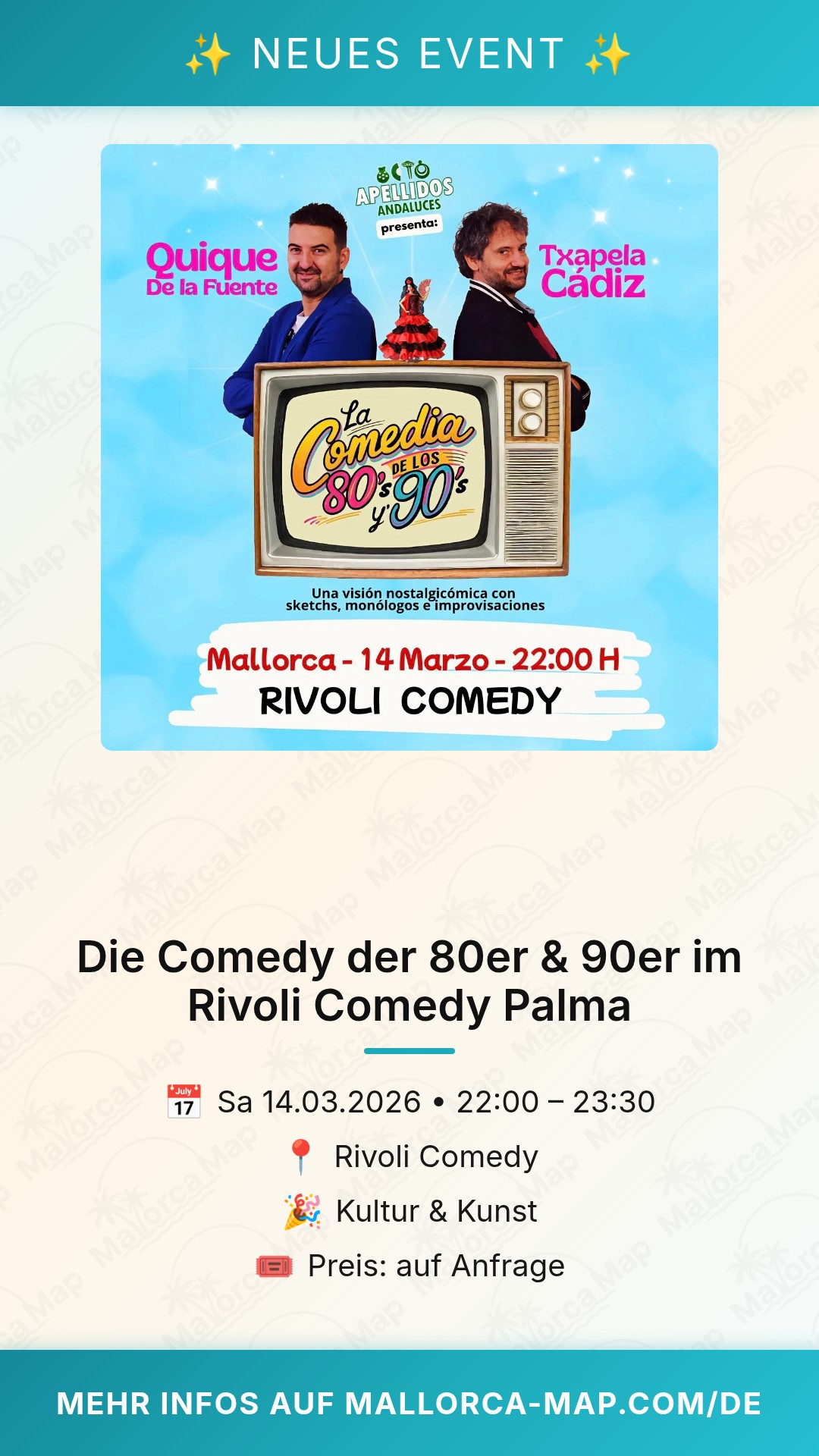 Sichere dir rechtzeitig deine Plätze im Rivoli Comedy. Erlebe, wie die 80er und 90er Jahre in Palma de Mallorca wieder lebendig werden – mit einer ordentlichen Portion Humor und einer Prise Wehmut. Wir sehen uns im Rivoli!