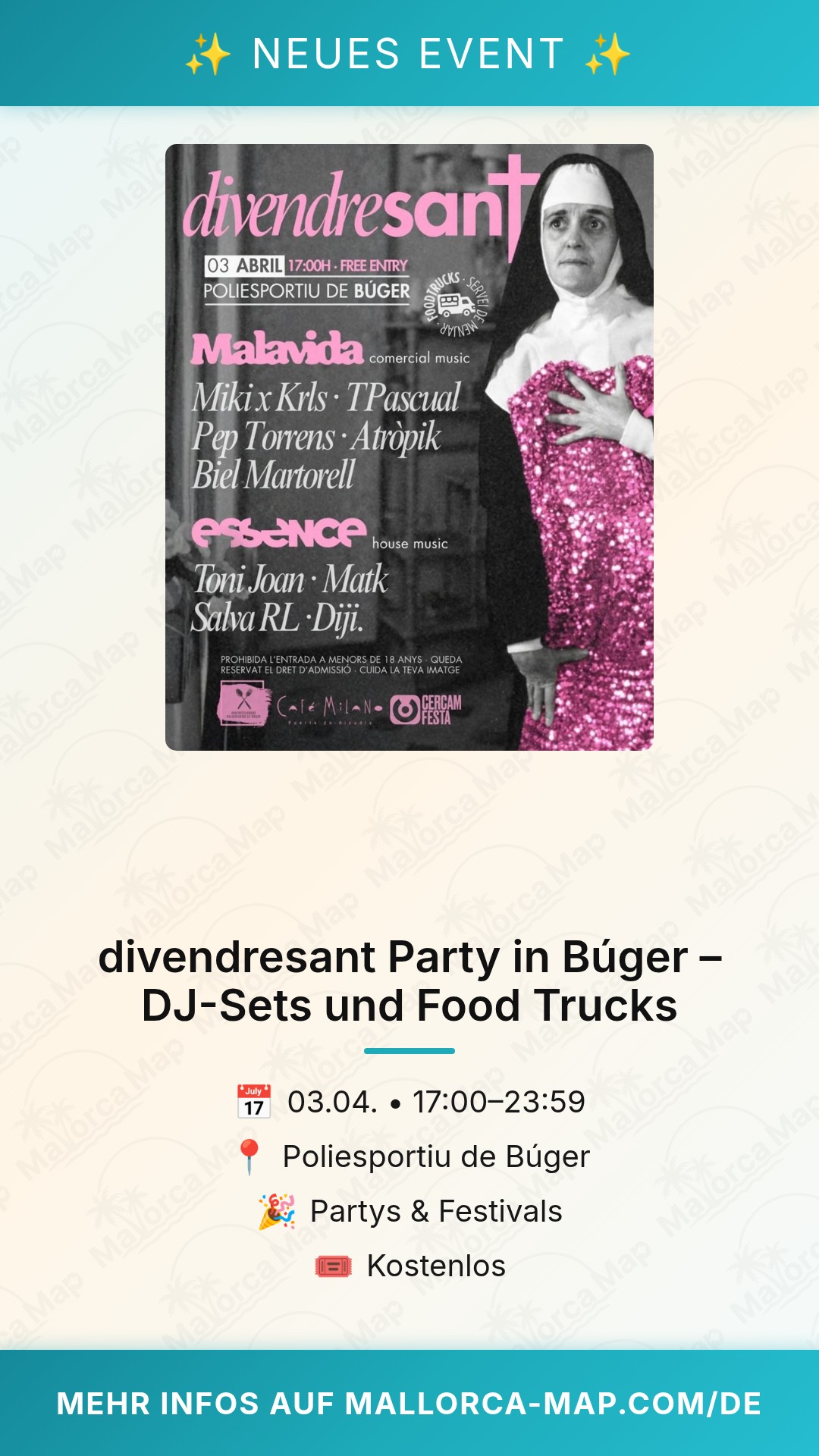 Búger selbst, eines der charmantesten Dörfer Mallorcas, bietet die perfekte Kulisse für dieses Event. Es ist bekannt für seine Authentizität, die an diesem Abend auf moderne Party-Kultur trifft. Pack deine Freunde ein und komm rechtzeitig vorbei, um dir einen guten Platz in der Nähe der Bühne oder bei den Food Trucks zu sichern. Da der Eintritt frei ist, empfiehlt es sich, früh da zu sein, um die volle Bandbreite des Programms ab 17:00 Uhr mitzunehmen. Wir sehen uns in Búger zum divendresant!