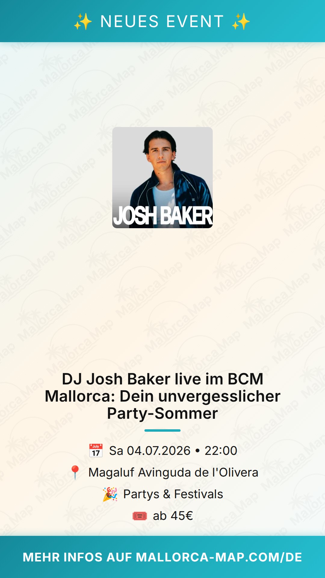 Mach dich bereit für den ultimativen Sound-Trip und erlebe einen der spannendsten DJs der aktuellen Szene live auf Mallorca. Es wird laut, es wird heiß und es wird definitiv legendär. Verpasse nicht die Chance, Teil dieser besonderen Party-Nacht zu sein und gestalte deinen Sommer 2026 unvergesslich. Pack deine Freunde ein und komm vorbei, um gemeinsam mit Josh Baker das BCM zum Überkochen zu bringen.