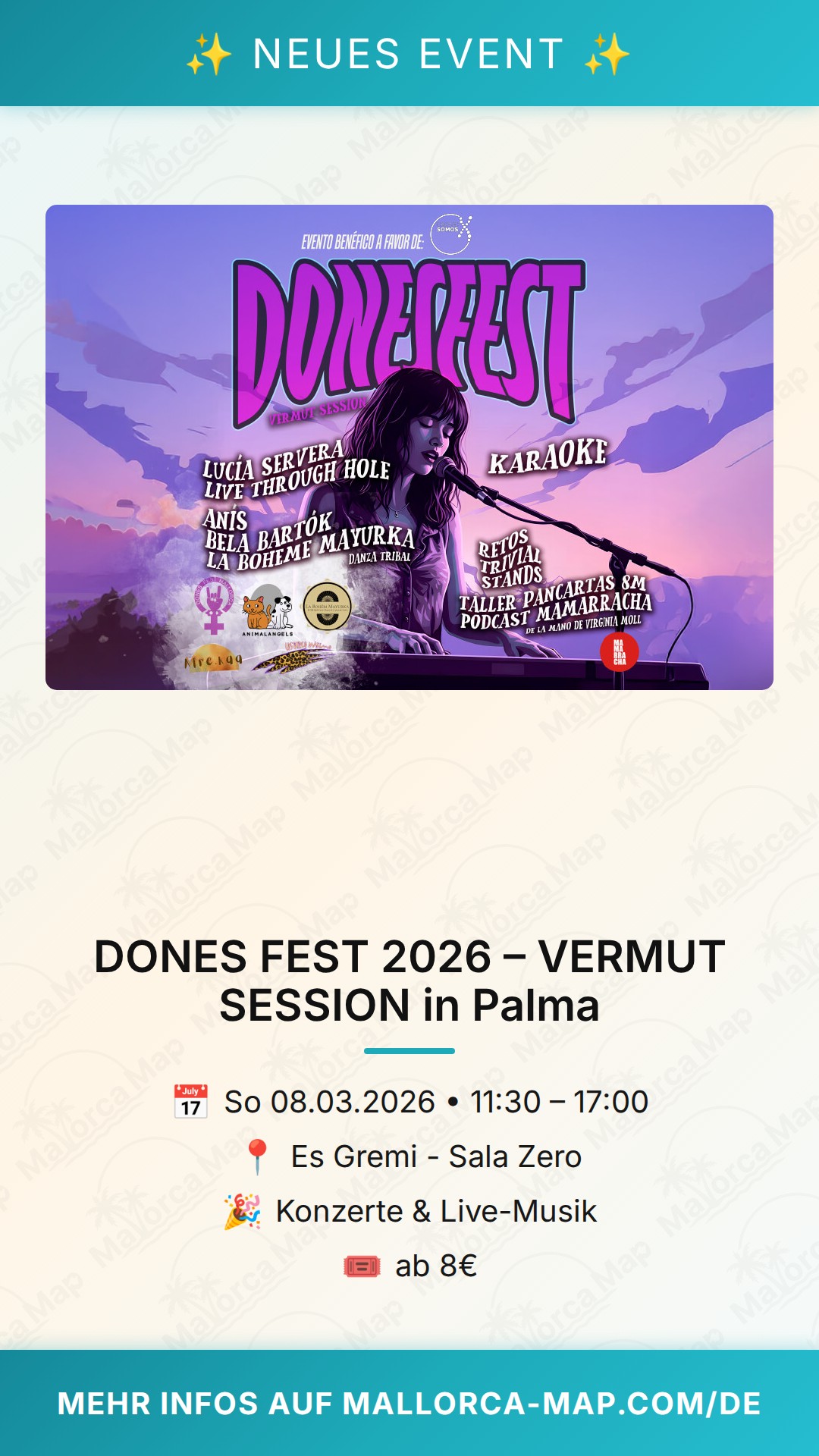 In der Sala Zero von Es Gremi setzen wir uns für Räume ein, in denen Kultur auch gesellschaftliche Transformation bedeutet. Das DONES FEST ist Musik, Gemeinschaft und Feier mit einem klaren Zweck. Da es sich um eine Benefizveranstaltung handelt, leistet dein Besuch einen direkten Beitrag zur Unterstützung wichtiger Projekte. Schnapp dir deine Freunde, genieße einen kühlen Vermut und feiere mit uns die Frauen und die Kultur in Palma. Wir sehen uns am 8. März um 11:30 Uhr – komm vorbei und erlebe es live!