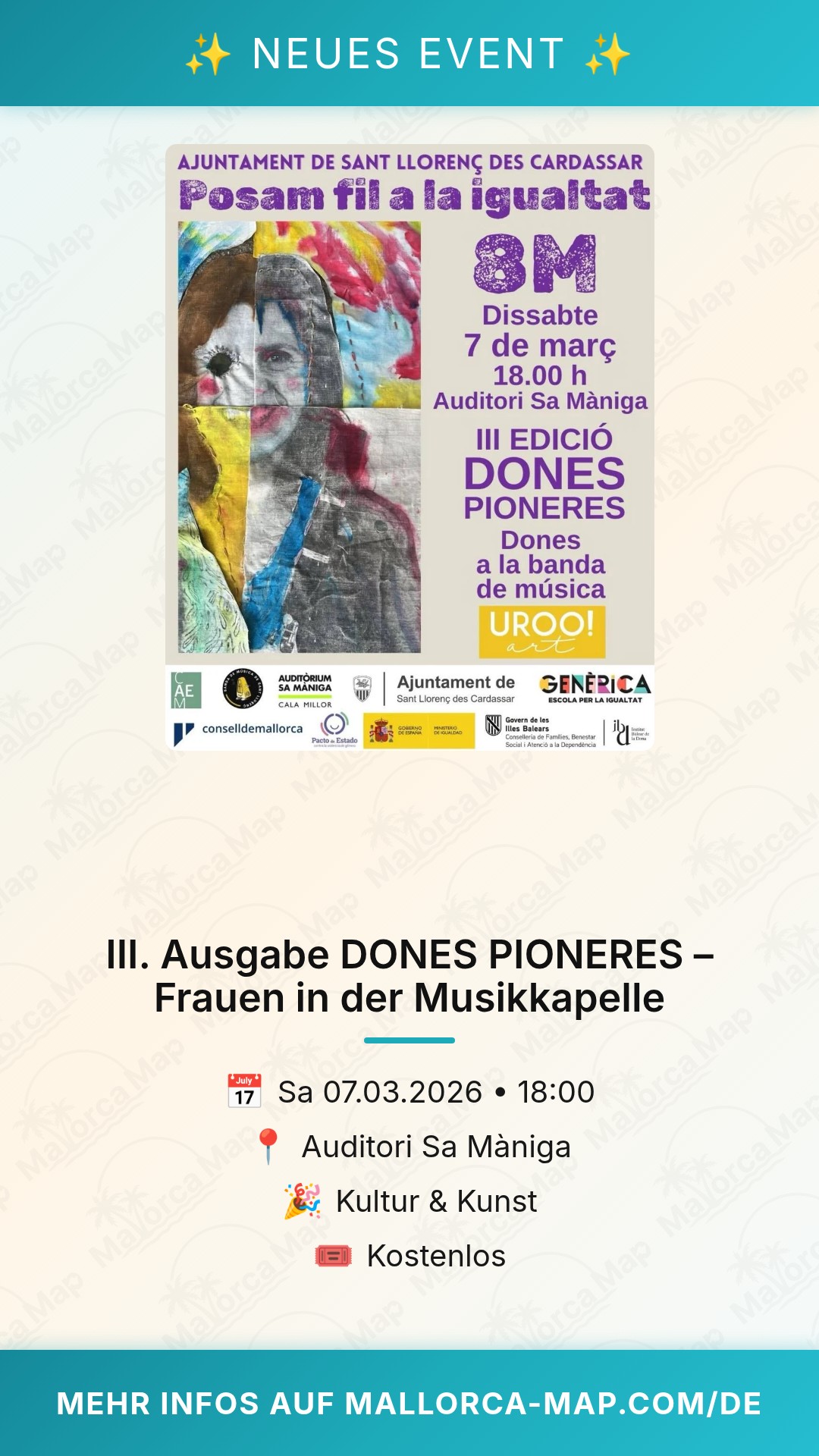 Das Beste daran? Der Eintritt ist frei, sodass jeder Teil dieser wichtigen Feier sein kann. Markiere dir den Termin rot im Kalender: Los geht es um 18:00 Uhr. Pack deine Freunde oder Familie ein und komm vorbei, um die „Dones Pioneres“ zu unterstützen. Ein Besuch im Auditori Sa Màniga lässt sich zudem hervorragend mit einem Spaziergang an der Strandpromenade von Cala Millor verbinden, bevor du dich ganz der Musik und der Geschichte widmest. Wir freuen uns darauf, dich bei diesem kulturellen Highlight im März zu sehen!