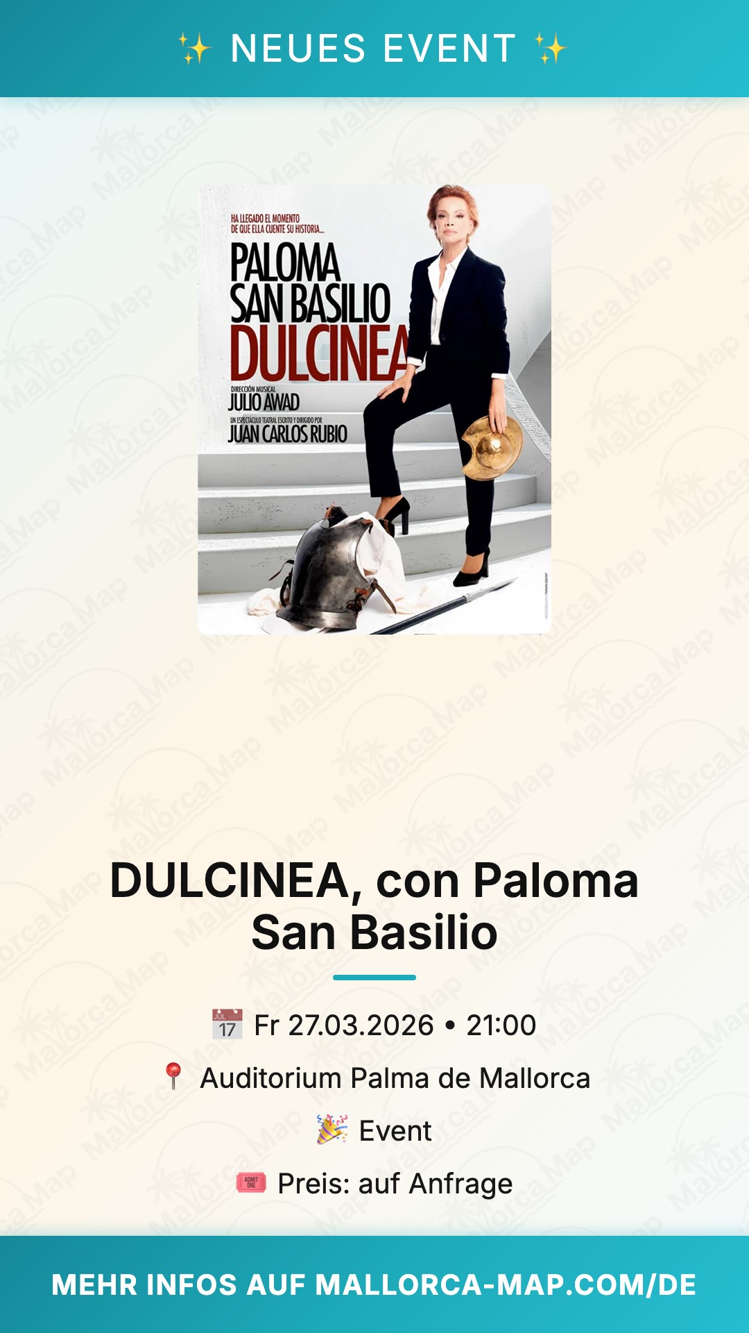 Erlebe einen magischen Abend in Palma de Mallorca, wenn die legendäre Paloma San Basilio mit ihrer Show DULCINEA die Bühne betritt. Am 27. März 2026 verwandelt sich das Auditorium Palma in einen Ort voller tiefer Emotionen und erstklassiger Unterhaltung. Dieses Konzerte-Highlight in Palma verspricht eine stimmgewaltige Performance, die du so schnell nicht vergessen wirst. Tauche ein in eine Welt, in der Musik und Theater auf einzigartige Weise verschmelzen, und lass dich von der ikonischen Künstlerin verzaubern, die seit Jahrzehnten die Massen begeistert.