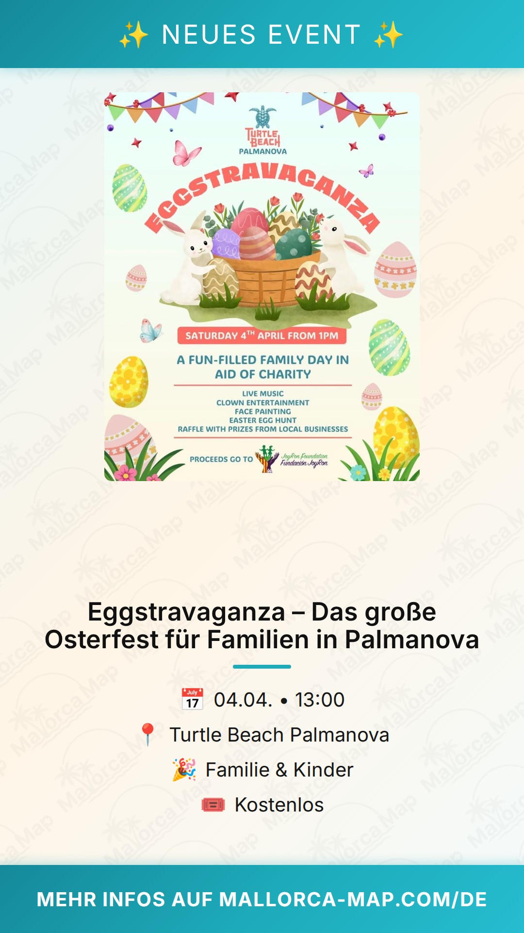 Der Eintritt ist frei, was dieses Event zum idealen Ausflugsziel für Einheimische und Urlauber gleichermaßen macht. Pack deine Liebsten ein und komm zum Turtle Beach in Palmanova. Es ist die perfekte Gelegenheit, die Gemeinschaft zu treffen, neue Leute kennenzulernen und gemeinsam den Frühling auf Mallorca zu feiern. Ob du wegen der Musik, der Ostereier oder einfach nur für den guten Zweck kommst – die Eggstravaganza bietet für jeden etwas. Wir freuen uns darauf, dich dort zu sehen und gemeinsam einen fantastischen Tag zu erleben. Verpasse nicht die Chance, Teil dieser wunderbaren Initiative zu sein.