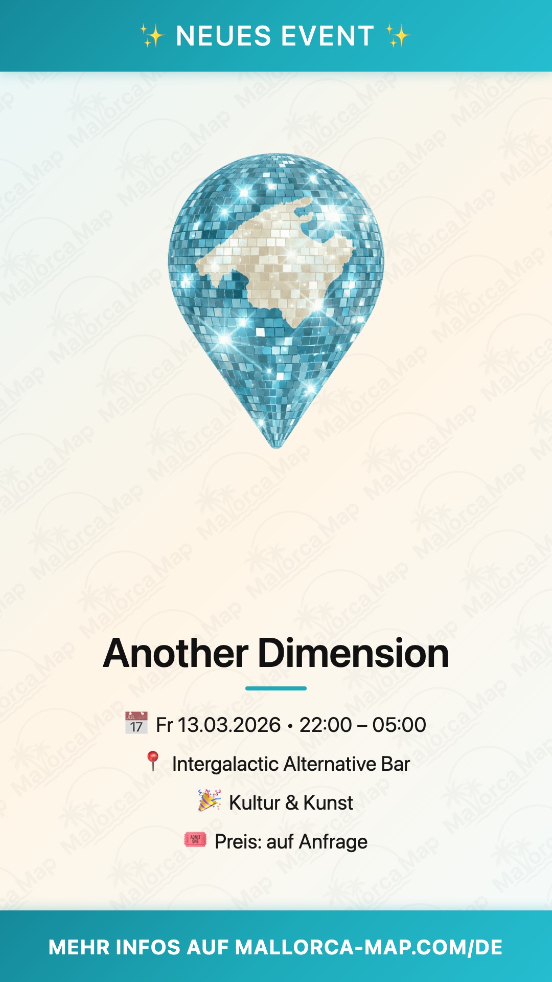 Komm pünktlich um 22:00 Uhr vorbei, schnapp dir dein Getränk und tauche ein. Die Eintrittskosten sind moderat, perfekt für einen entspannten Abendstart. Entdecke Another Dimension live und lass dich von Palmas alternativer Seite verzaubern – wir sehen dich dort!