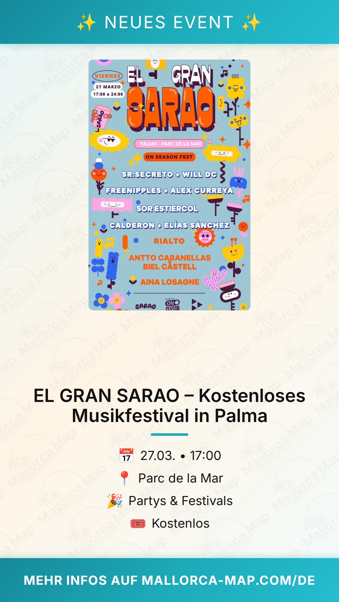 Praktische Informationen: Das Event beginnt pünktlich um 17:00 Uhr. Da es sich um eine Veranstaltung im Freien handelt, empfehlen wir dir, frühzeitig zu erscheinen, um dir einen guten Platz in der Nähe der Bühne zu sichern. Der Parc de la Mar ist zentral gelegen und sowohl zu Fuß als auch mit öffentlichen Verkehrsmitteln aus ganz Palma gut erreichbar. Verpasse nicht die Chance, Teil dieses großen musikalischen Get-togethers zu sein. Wir sehen uns bei EL GRAN SARAO – dem musikalischen Highlight des Frühlings in Palma!