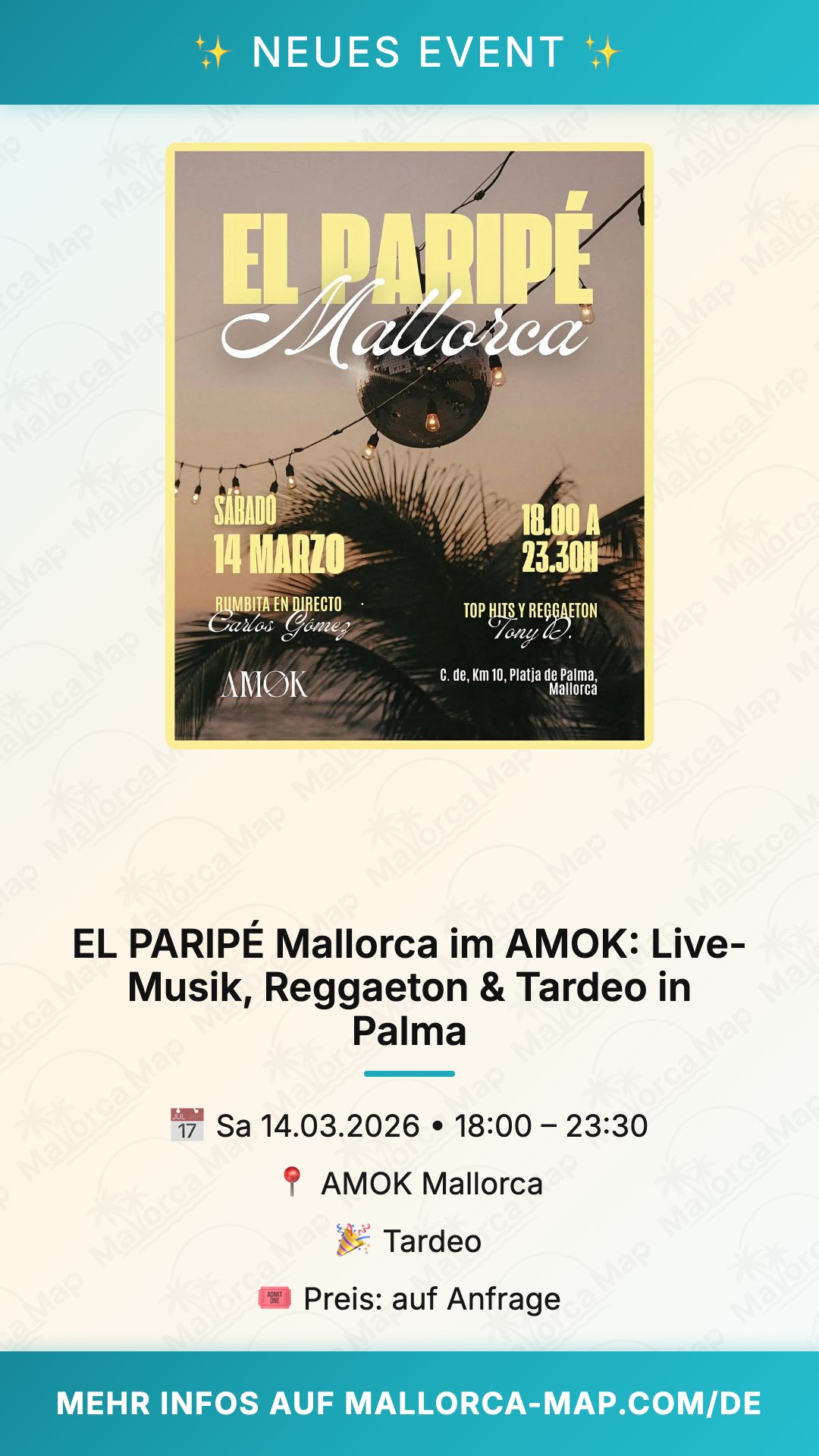 Bist du bereit für den ultimativen Samstagnachmittag auf der Insel? Wenn die Sonne langsam tiefer steht und die Stimmung in der Platja de Palma steigt, gibt es nur einen Ort, an dem du sein solltest: EL PARIPÉ im AMOK Mallorca. Am 14. März 2026 verwandelt sich einer der angesagtesten Clubs der Insel in eine pulsierende Bühne für alle, die das echte mallorquinische Lebensgefühl lieben.