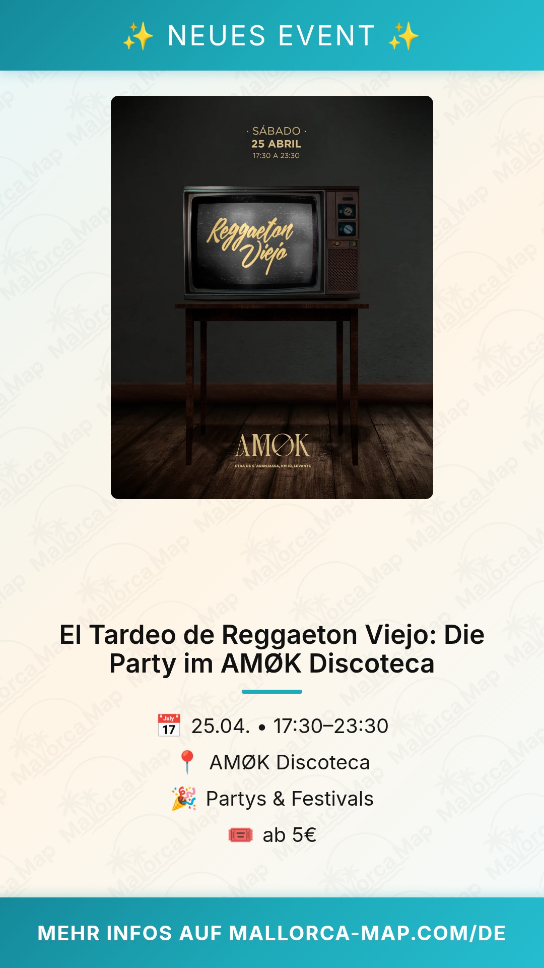 Sichere dir rechtzeitig deinen Platz für diesen besonderen Abend. Da solche Events im AMØK Discoteca oft sehr beliebt sind, lohnt es sich, frühzeitig zu planen. Schnapp dir deine Freunde, zieh deine Tanzschuhe an und mach dich bereit für eine Reggaeton-Nacht, die dich garantiert zum Schwitzen bringt. Wir freuen uns darauf, dich auf der Tanzfläche zu sehen und gemeinsam die alten Zeiten hochleben zu lassen. Komm vorbei und erlebe den authentischen Reggaeton-Spirit mitten in Mallorca. Lass dir dieses Highlight nicht entgehen und sei dabei, wenn das AMØK die Klassiker auspackt!